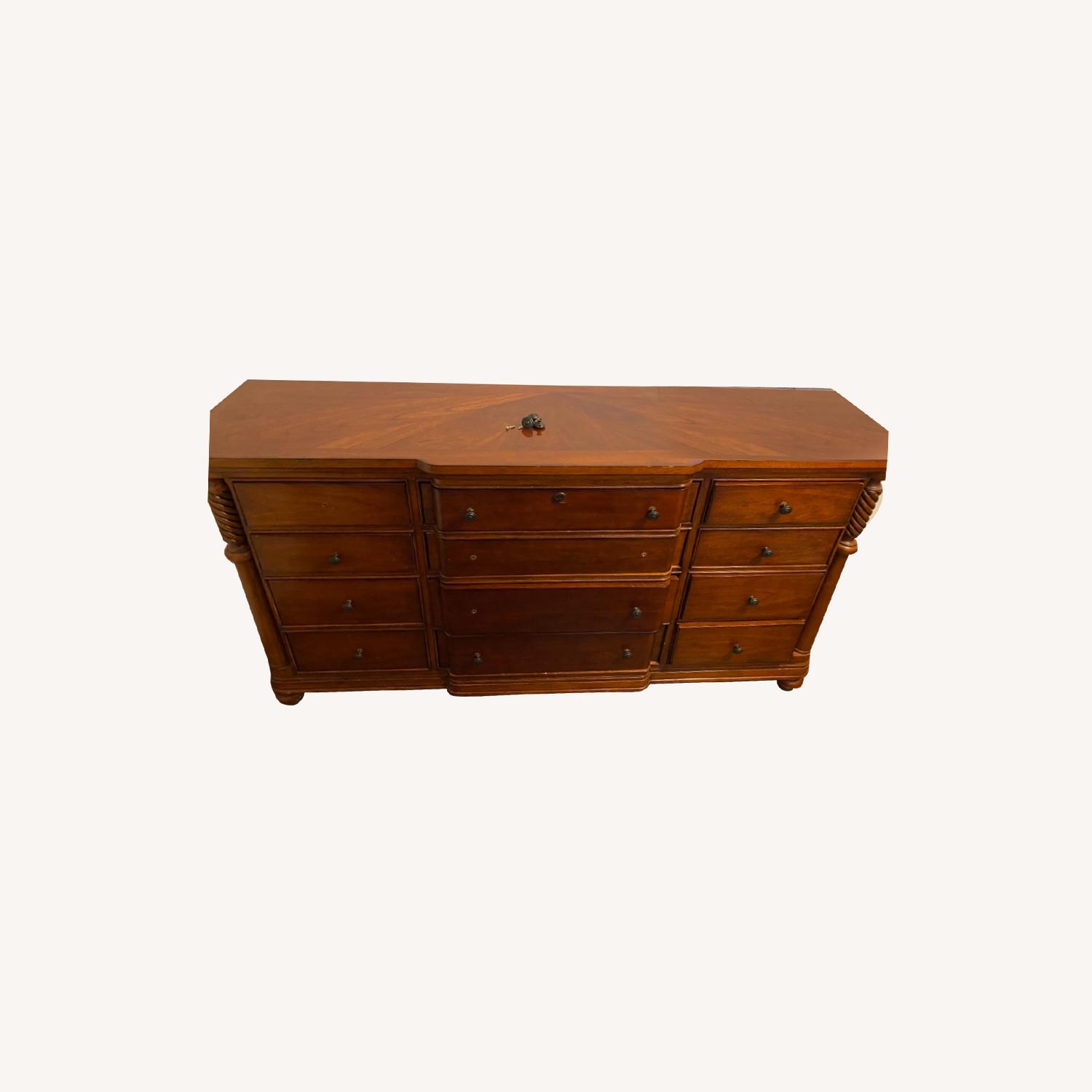 Seller's Notes:Beautiful 12-drawer wood dresser. In very good condition throughout and piece was custom made with elegant finish and detail. The drawers are spotless as if never used. Allows for ample storage of clothing and makes a statement piece for a bedroom or other living area space.
