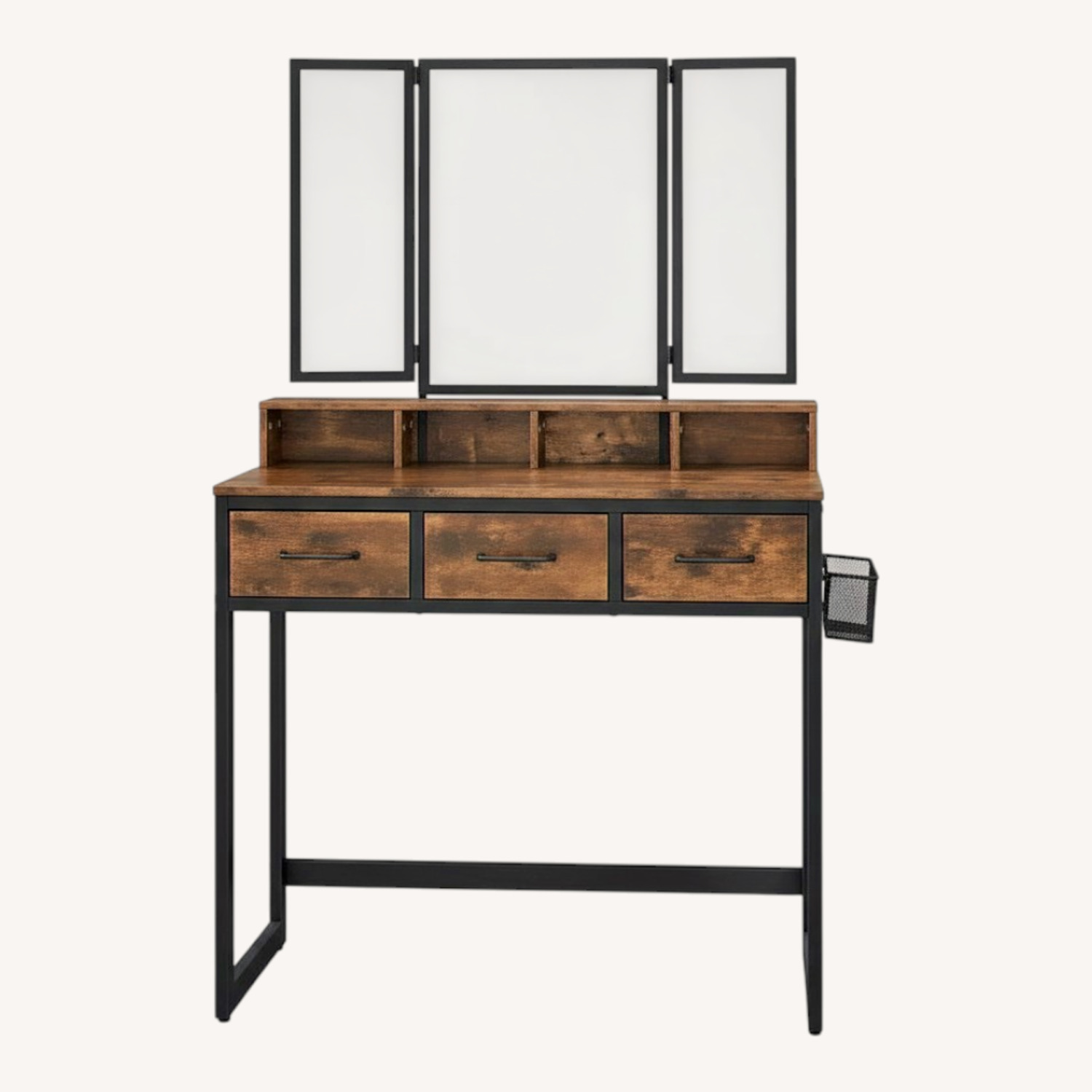 Seller's Notes:This is a black/brown vanity with a trifold mirror setup. There are no scratches on the mirror. It comes with a stool you can push underneath the vanity once you're done to conserve space. Originally bought from Wayfair. One of the three drawers is a bit wobbly