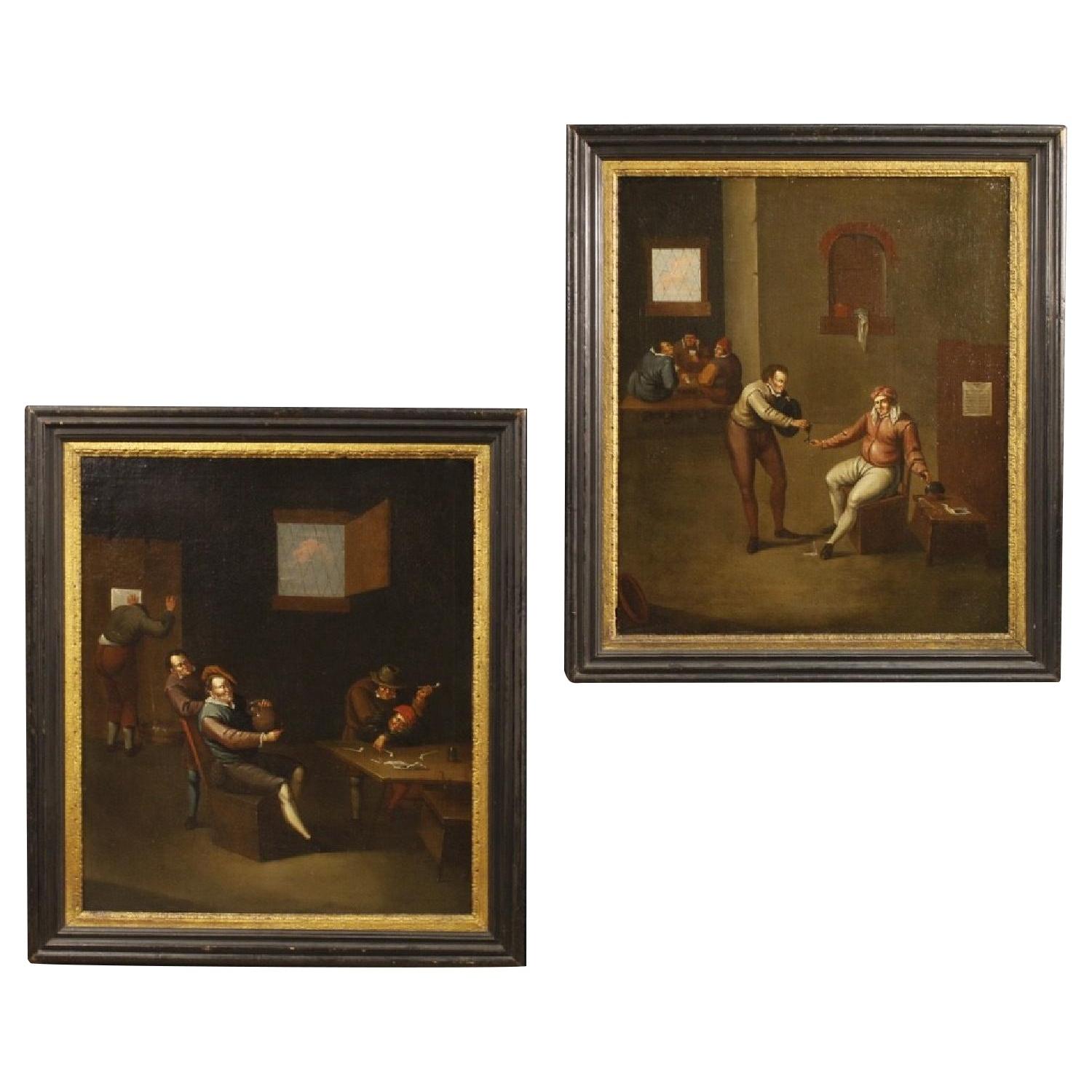 17th Century Oil On Canvas Flemish Interior Scenes Paintings