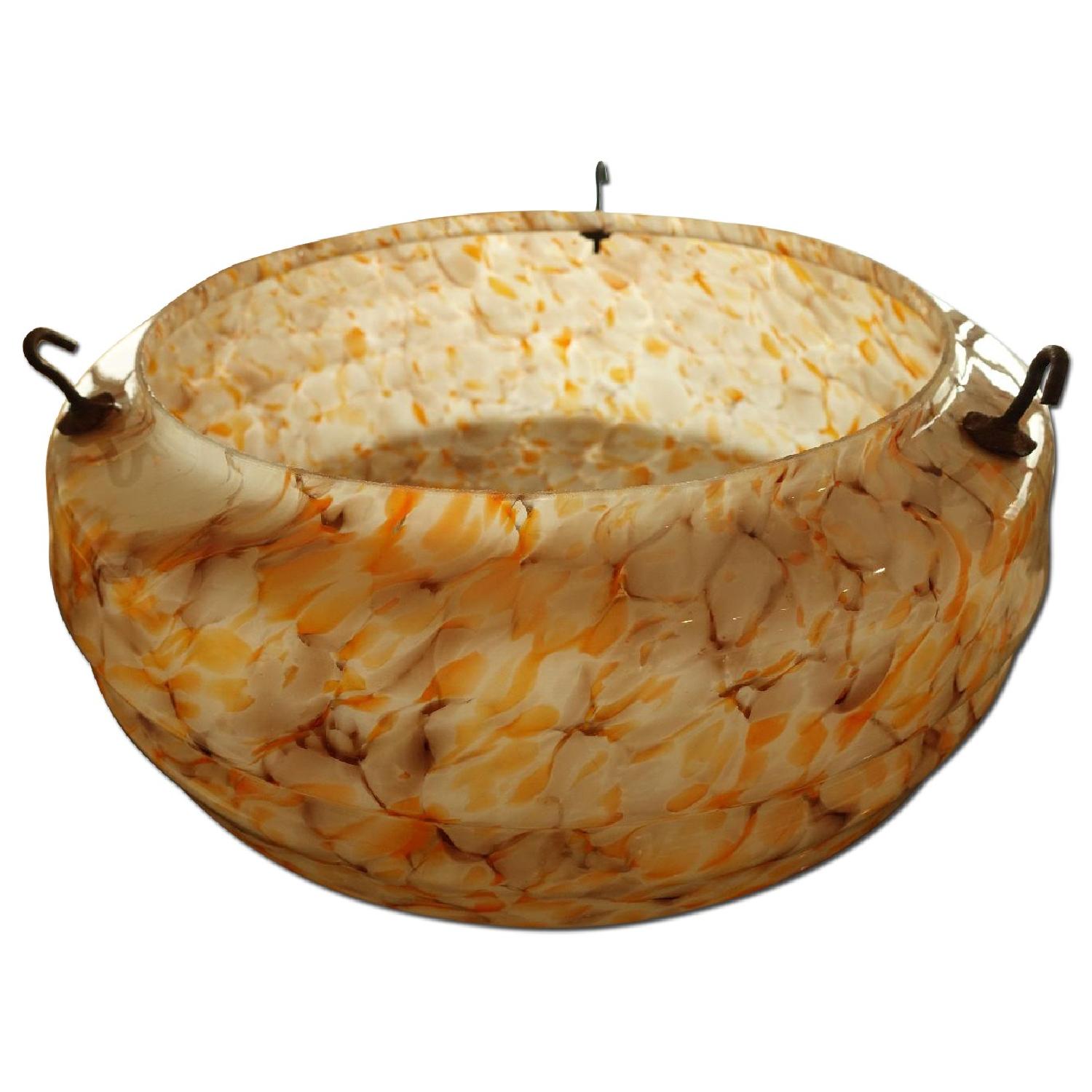Seller's Notes:Original 1930s Art Deco ceiling light pendant shade in a beautiful orange, white and grey speckled pattern from England. The glass of this Art Deco pendant is in excellent condition. There are no chips or cracks and it still retains its original gloss. The metal hooks are original and quite rusty - although I haven't attempted to clean the rust. The lamp hangs from 3 chains which are not included. You will be able to find a "chain hook ceiling rose " and chains from lighting store such as Edison Light Globes online.