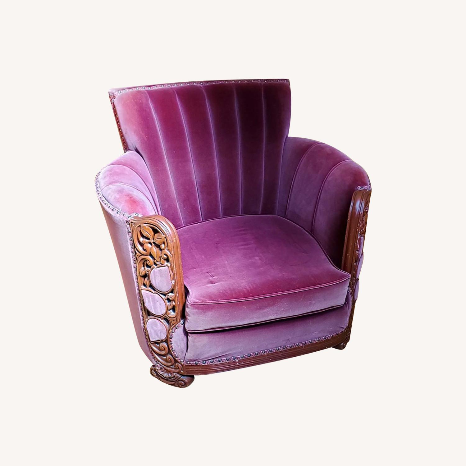 Seller's Notes:1930s Classic Art Deco Club Chair in Burgundy Mohair Velvet The Sides Have Unusual Inserted Velvet Decorative Leaves. The covering Fabric Is in Flawless Condition Albeit Slightly Faded. Wood Is In Good Condition But Needs A Strong Polish to Re-Finish 35” Width X 35” Depth X 39” Height $1200 Home is Non-Smoking with No Children and No Pets Local Delivery or Pick Up Only