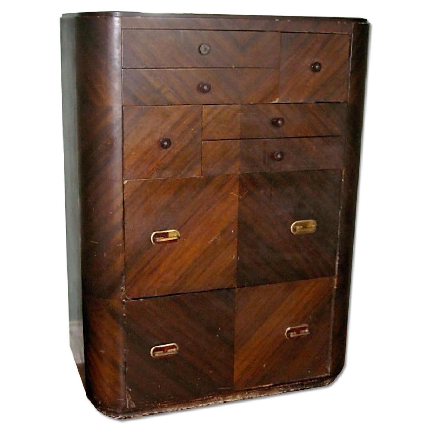 Seller's Notes:This wonderful American art deco, 1930's dresser in the style of iconic designer Donald Desky or Paul Frankl features a bowed streamlined design composed of dark, mahogany wood with brass hardware pulls and horn-colored bakelite knobs.