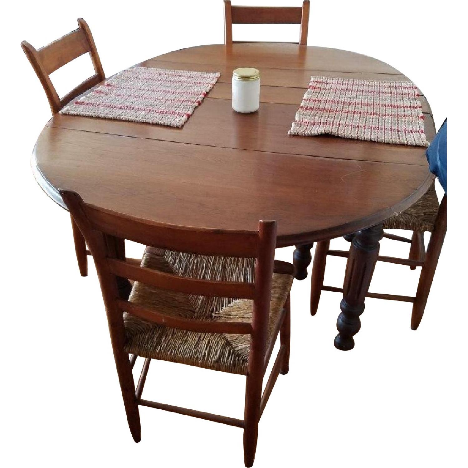 Seller's Notes:This dining room set has been in our family for three generations, and now must find a new home. It is a solid oak, 1930s-era dining room set with four rush seat chairs. It has drop-leaves on both ends that provide flexibility with table length.