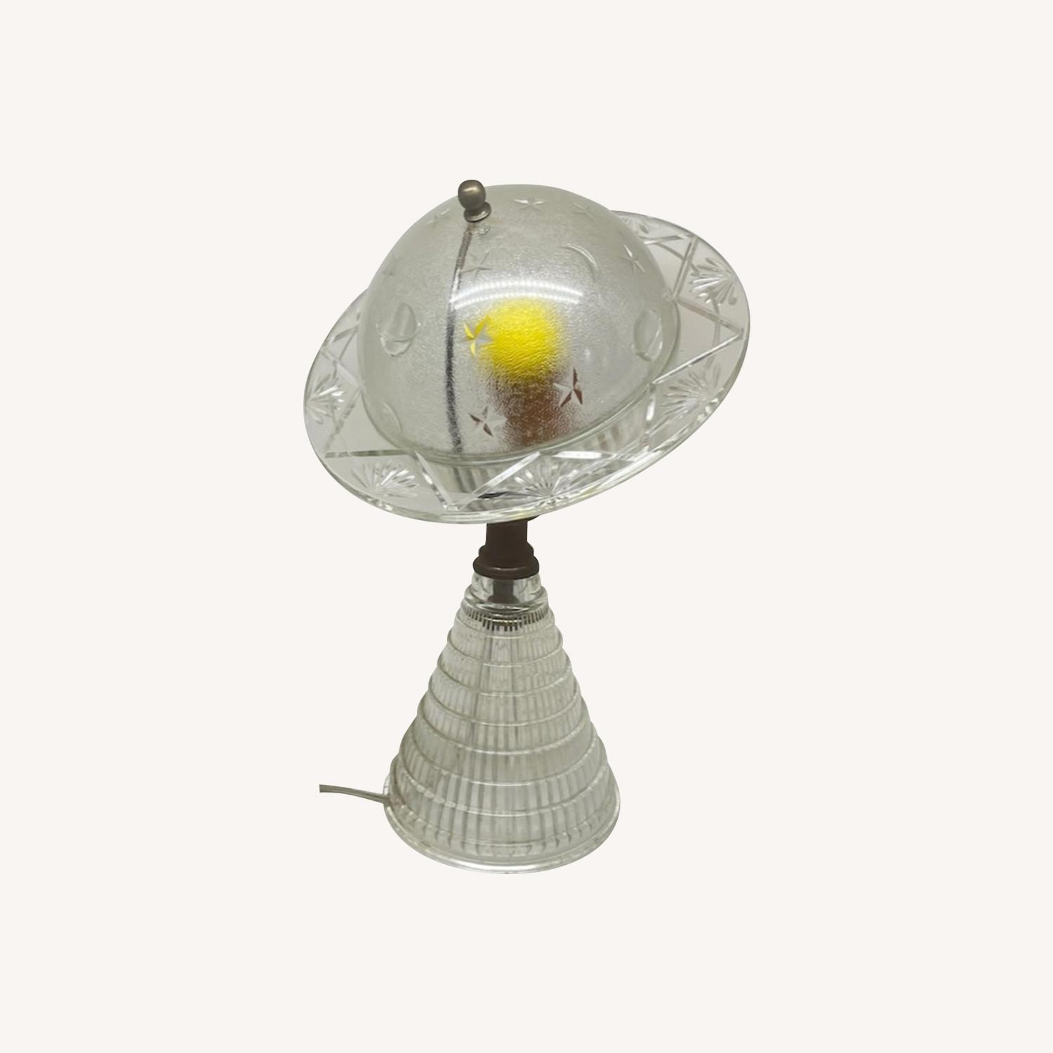 Seller's Notes:1938 World Fair Art Deco Glass Satturn Lamp: This very rare lamp was made in 1938 for the World Fair. It is clear glass with star and planet designs molded into the top section of the lamp which can be lifted off to change the bulb.