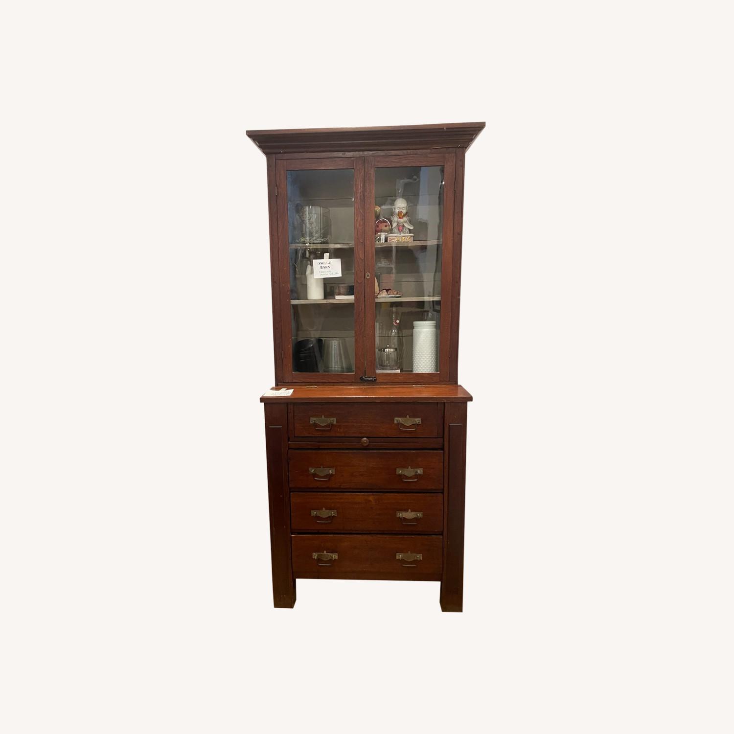 Seller's Notes:Vintage wooden medicine cabinet with glass doors and unique pulls. In excellent vintage condition, some minor marks from age. 31W x 17D x 73H. Bottom half is 34 1/2H. Cabinet is 7 1/2D.