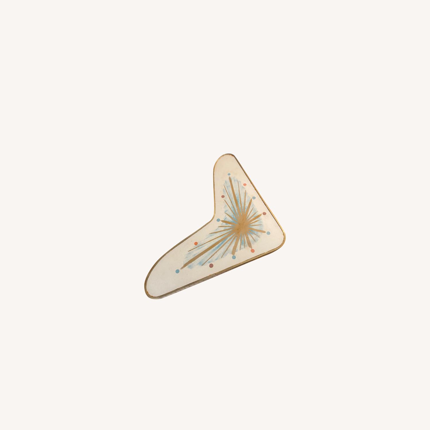Seller's Notes:Original boomerang table from the 1960’s. The back was redone with natural wood and legs were replaced with original Midcentury legs. The sides are comprised of mother of pearl rectangles. A few minor discoloration that don’t take away from the beauty of the table. It’s in great condition. Well taken care of. It’s a great piece. I don’t want to get rid of it but it’s too big for my living room.