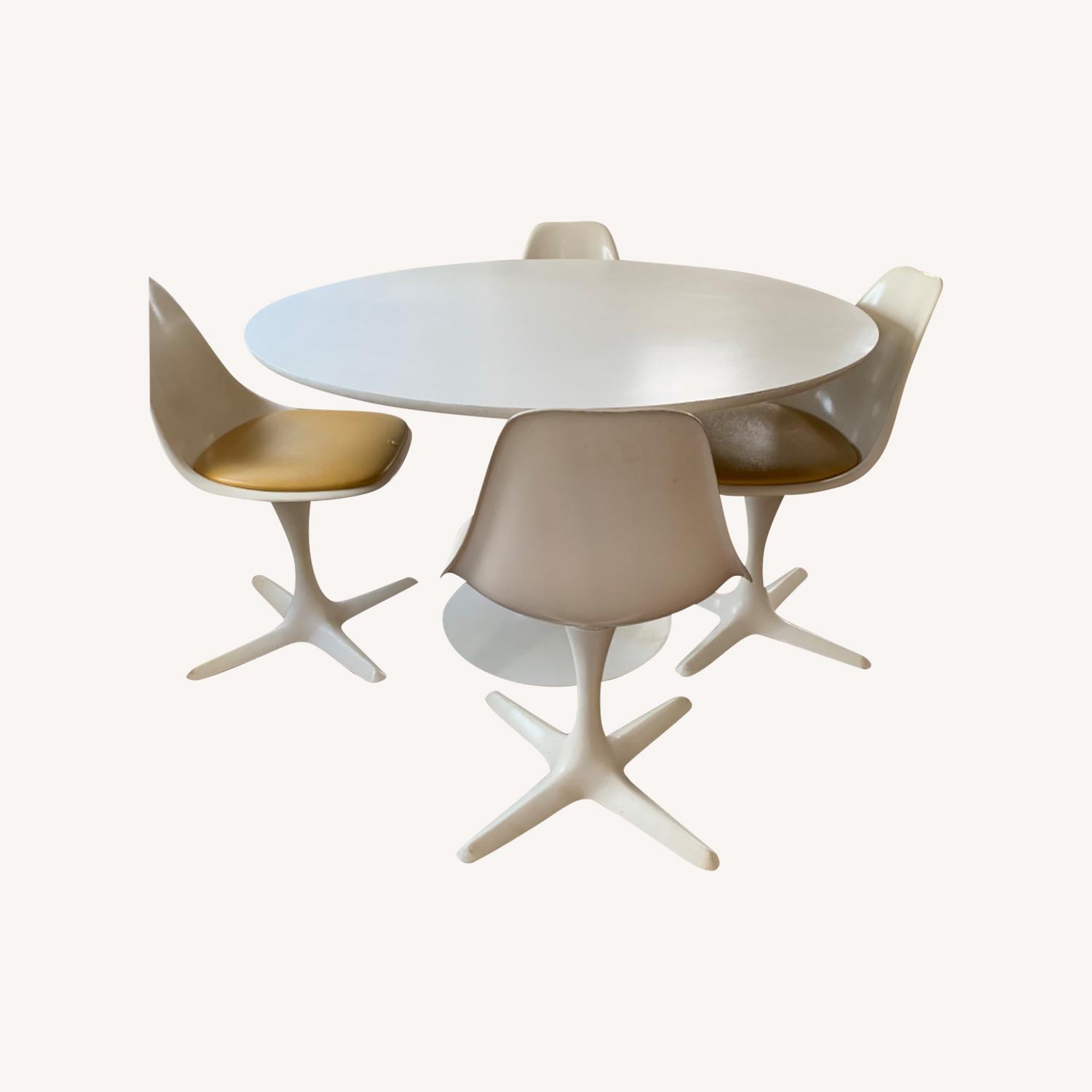 Seller's Notes:Awesome set from the 1960s. Chairs do not swivel. Included in the purchase are two extra Burke chairs. Two blemishes as seen in photos in vinyl seat.