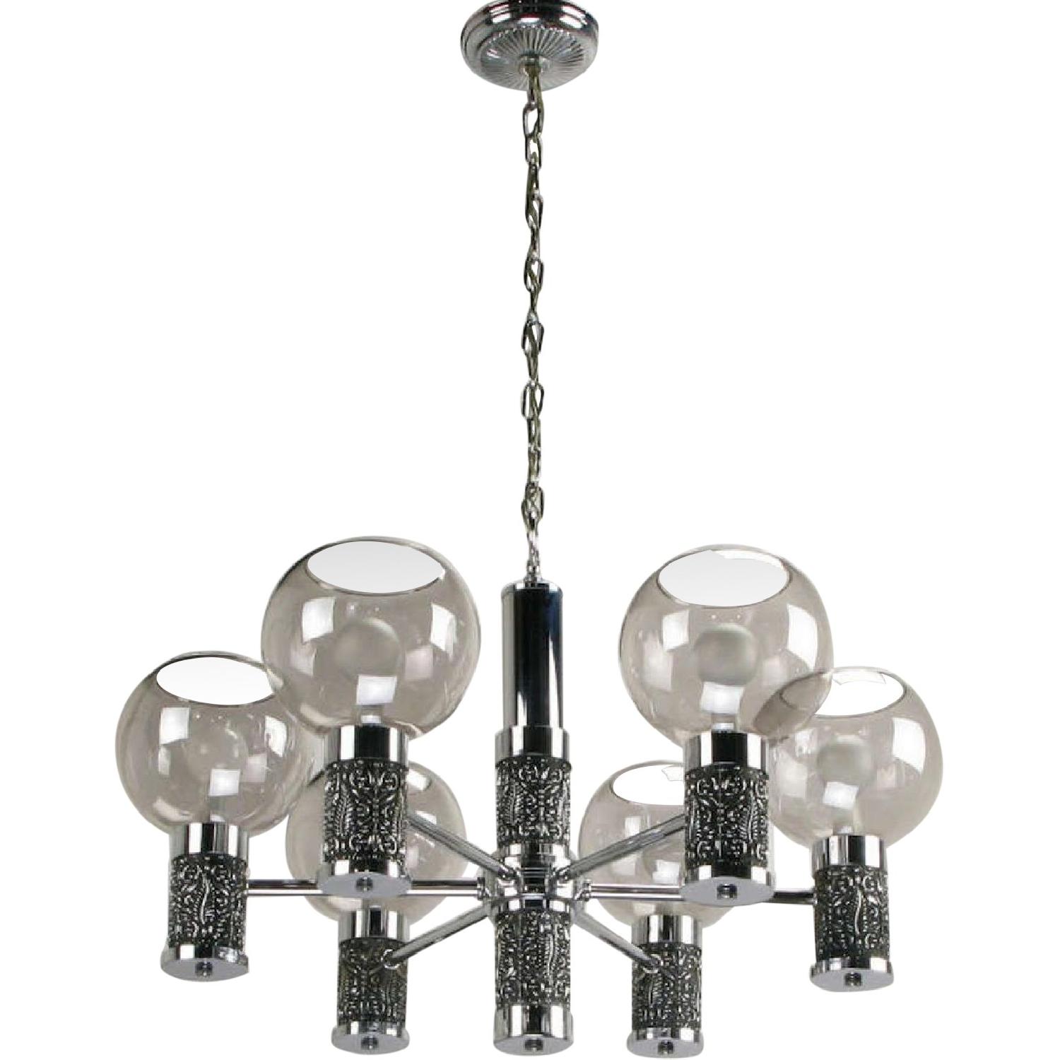 1960's Chrome & Smoked Glass Chandelier w/ Foliate Relief Detail