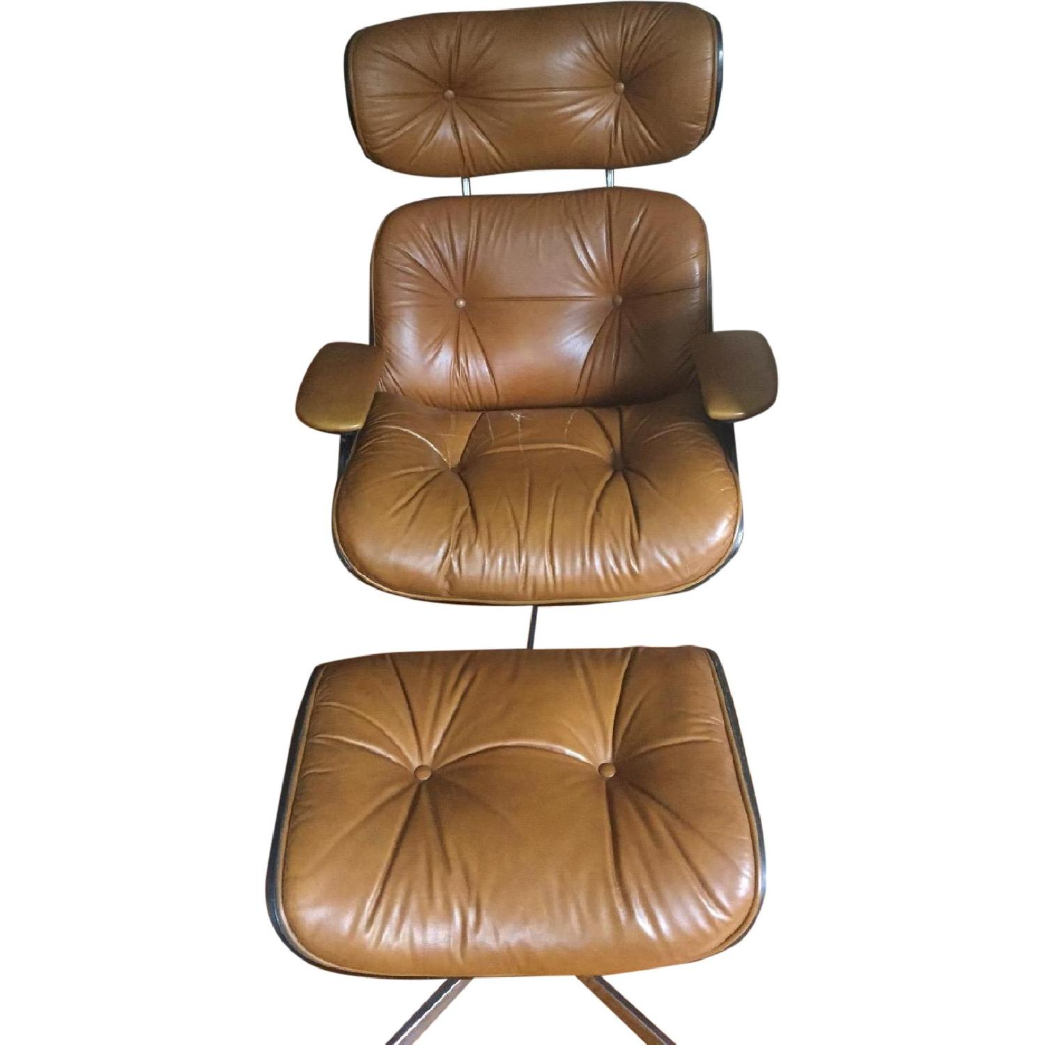 Seller's Notes:Original owner. Faux leather, wooden frame, chrome base. Wear consistent with age and use (scratches back that might be touched up. Fabric worn on seat). Swivel and Reclines (rocks) without issues.