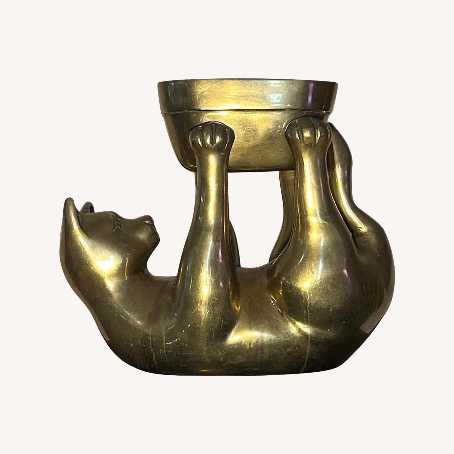 Seller's Notes:MCM Large solid brass cat statue and planter. One of the most unique brass pieces I’ve seen from this time. Made in Korea. The bottom has a felt green pad. The planter is removable. 14lbs!