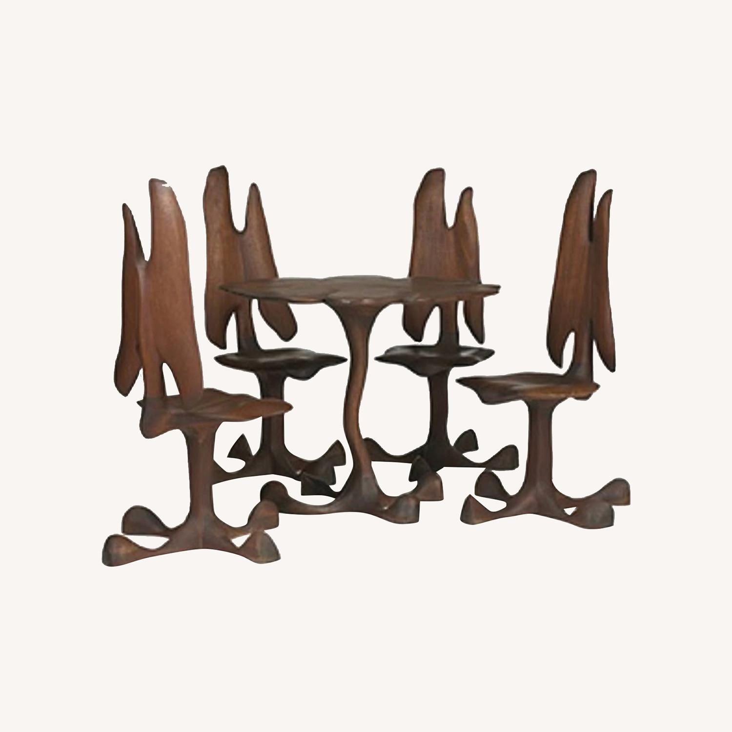 Seller's Notes:Hand carved dining room set with four chairs and 1 table, made from mahogany and walnut in 1972 by artist Andrew J. Willner. This piece is a one of a kind table in great, vintage condition.
