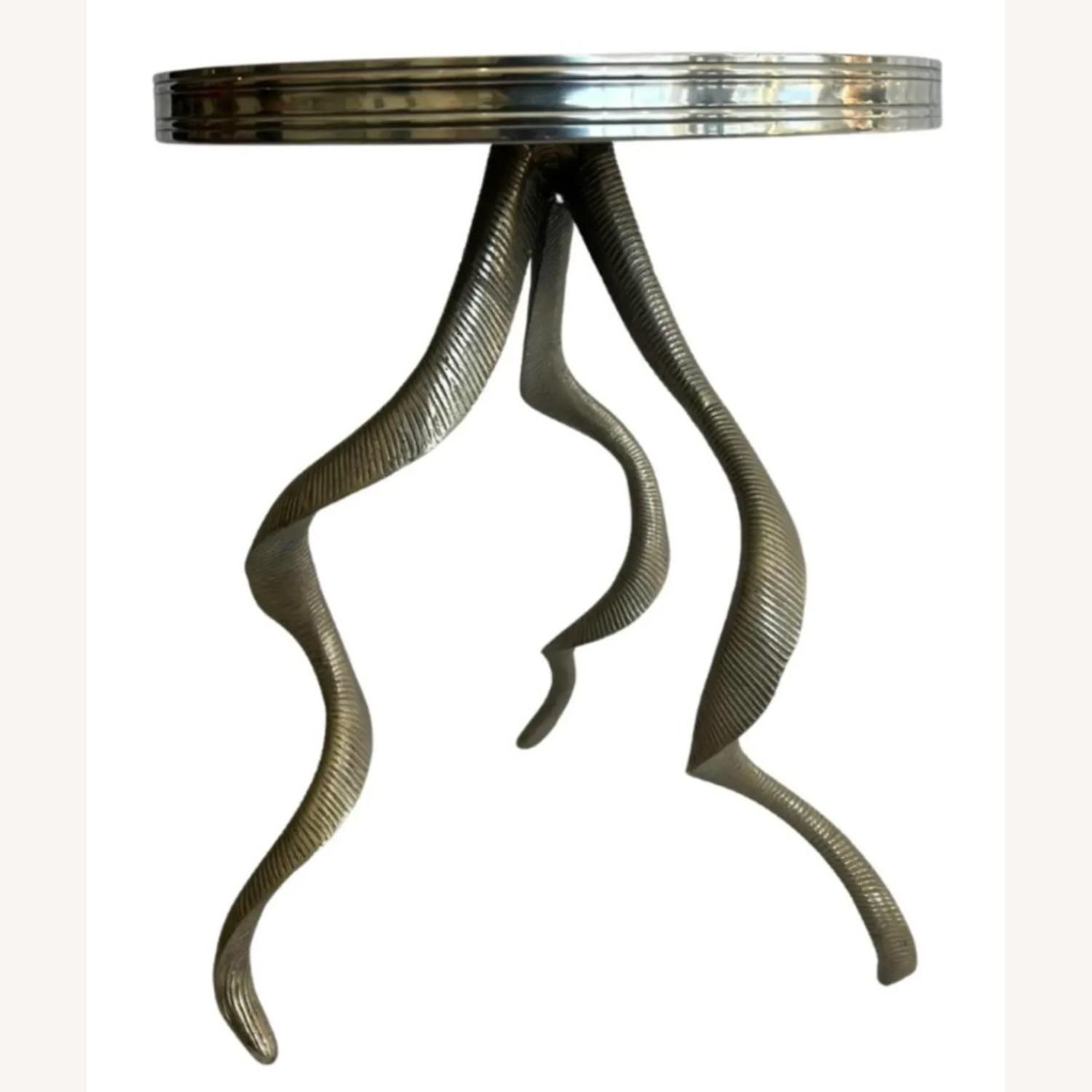 Seller's Notes:Arthur Court c. 1980's Aluminum Side / Accent Table The Legs have a French Gueridon Twirling Motif 3 Abstract Legs with a Round Table Top