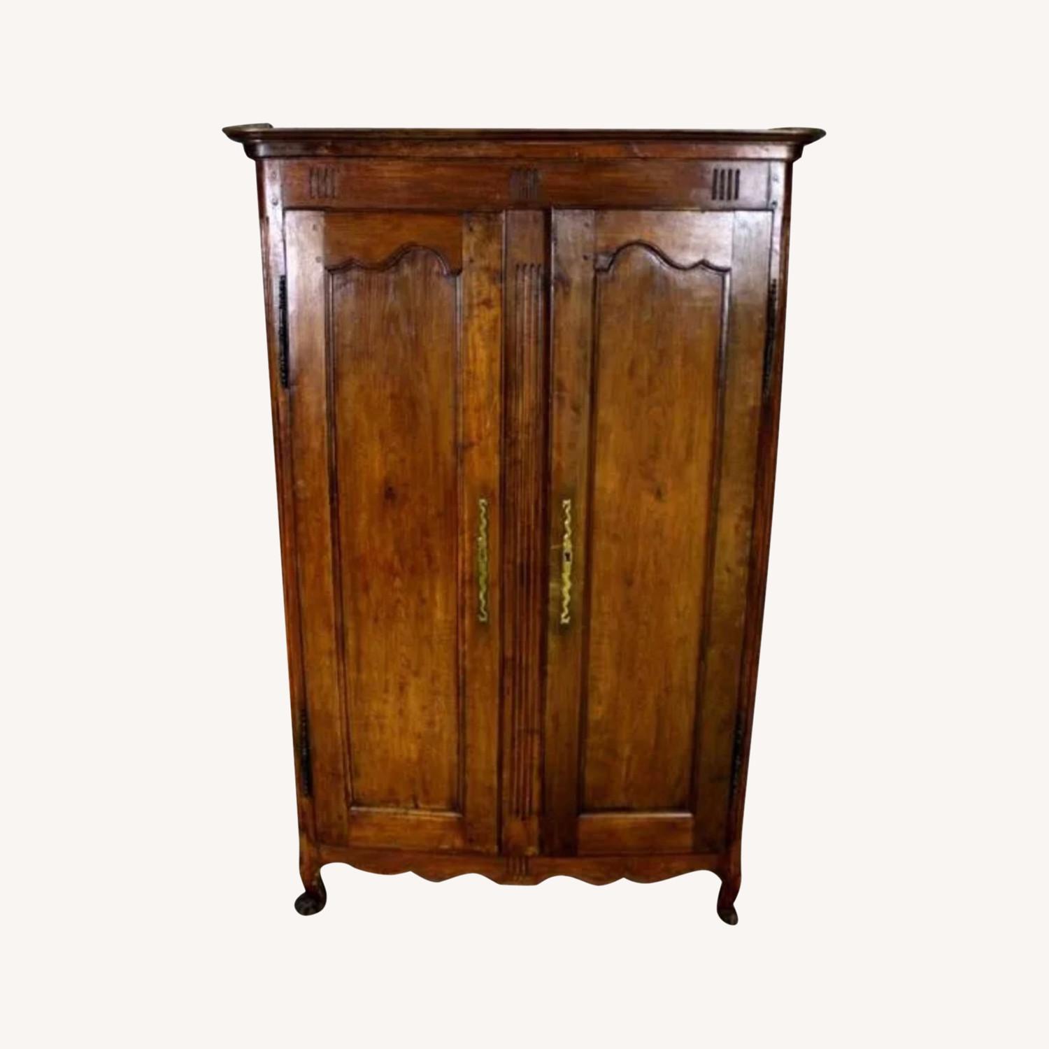 Seller's Notes:Beautifully carved solid oak armoire with three shelves. Fantastic storage, beautiful oak wood tone. Original hardware, peg wood construction. Cabriole legs, hole in back for wires - perfect for TV or other media storage.