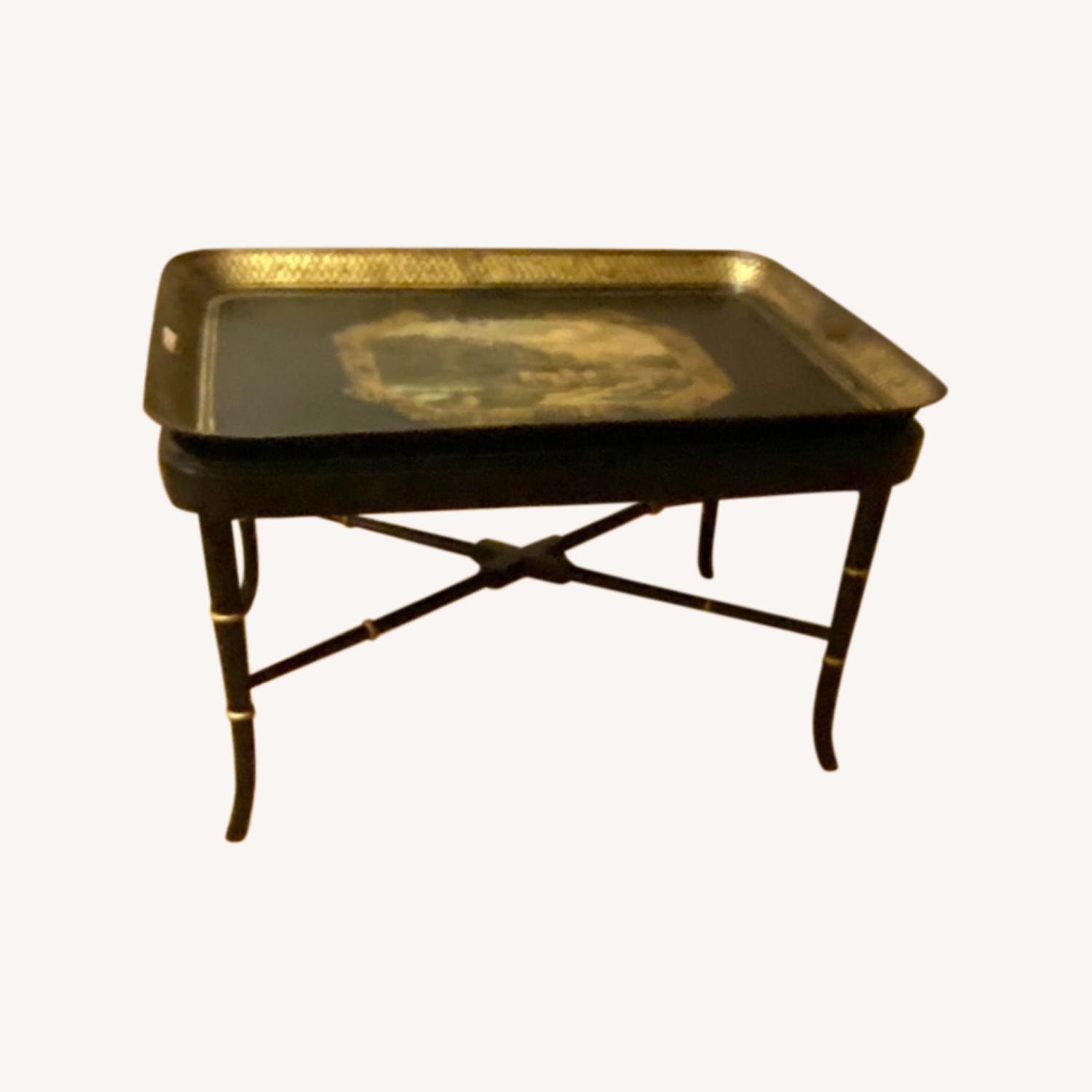Seller's Notes:19th century English / European hand painted tole tray table with a custom lacquered black & gold bamboo base Regency style continental Rare antique tole tray can be removed and used for easy serving and entertaining as serving tray or decorative tray, or as a coffee table upon contemporary black & gold bamboo base by Scully & Scully custom fitted to the tray for optimal support and use as a sturdy table Gold gilt edges frame a handpainted rustic scene with shepherd and cattle in gorgeous countryside Bamboo & gold legs add contemporary flare and make the table sturdy while highlighting its rare vintage unique tole
