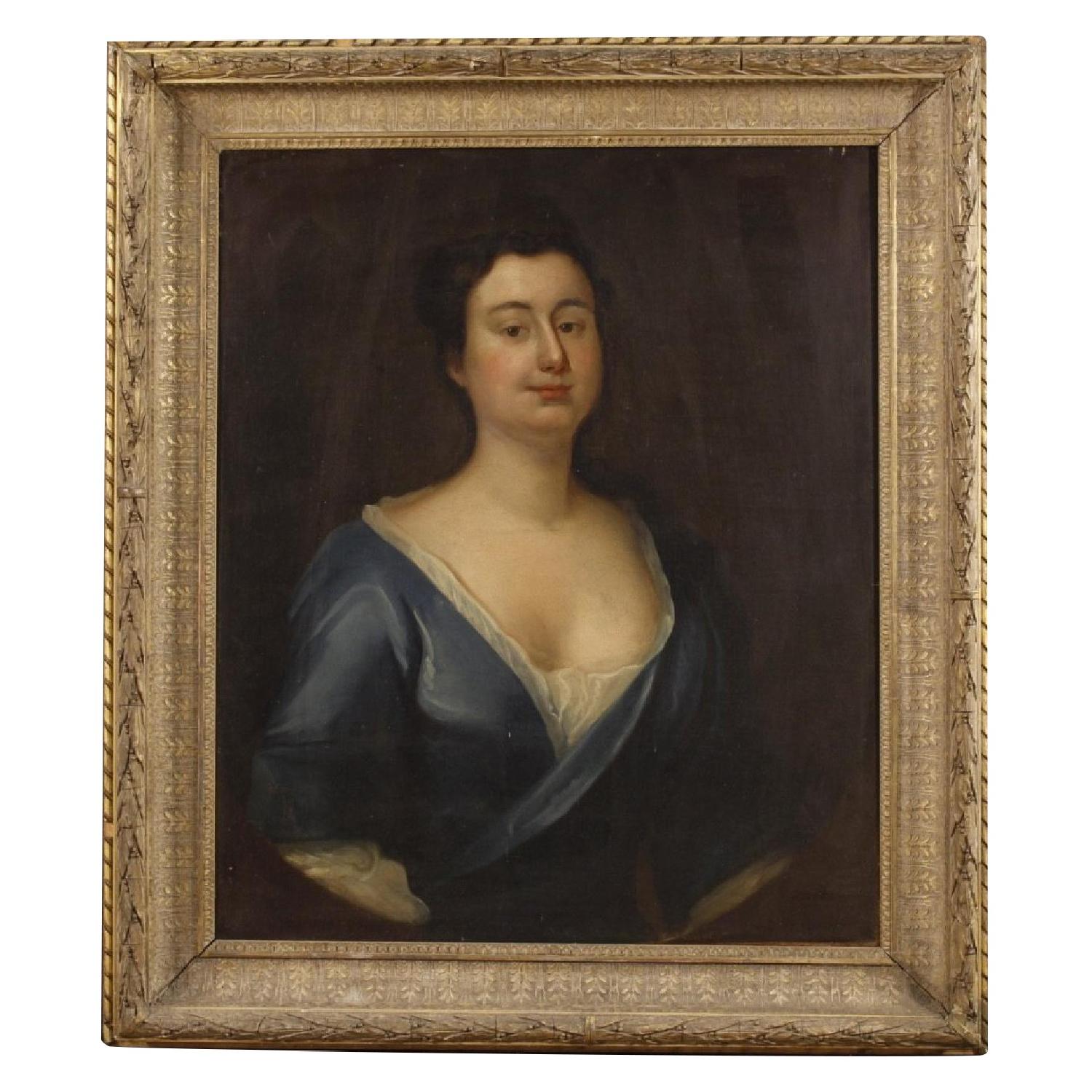 Seller's Notes:Antique French painting from the first half of the 19th century. Framework oil on canvas depicting a portrait of a woman of good pictorial quality. Oval painting on rectangular canvas and frame. A non-coeval frame, readapted to the painting, in richly carved, gilded and lacquered wood and plaster, with some signs of wear. Painting of beautiful decoration, for antique dealers and collectors. Work that has undergone a conservative restoration, overall in good state of conservation. Sight size H 74 x W 60 cm.