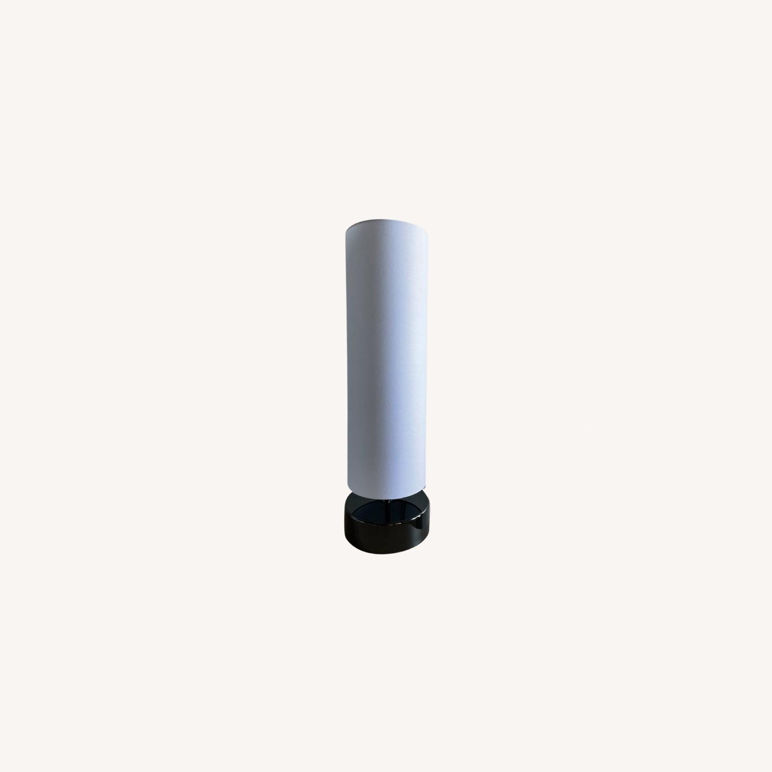 Seller's Notes:2 CB2 table lamps for sale. Polished black nickel table lamp turns on/off and adjusts to three brightness settings with a simple tap of the base. Tall white poly-cotton blend cylinder shade tops it off in simple style. White poly-cotton blend fabric shade