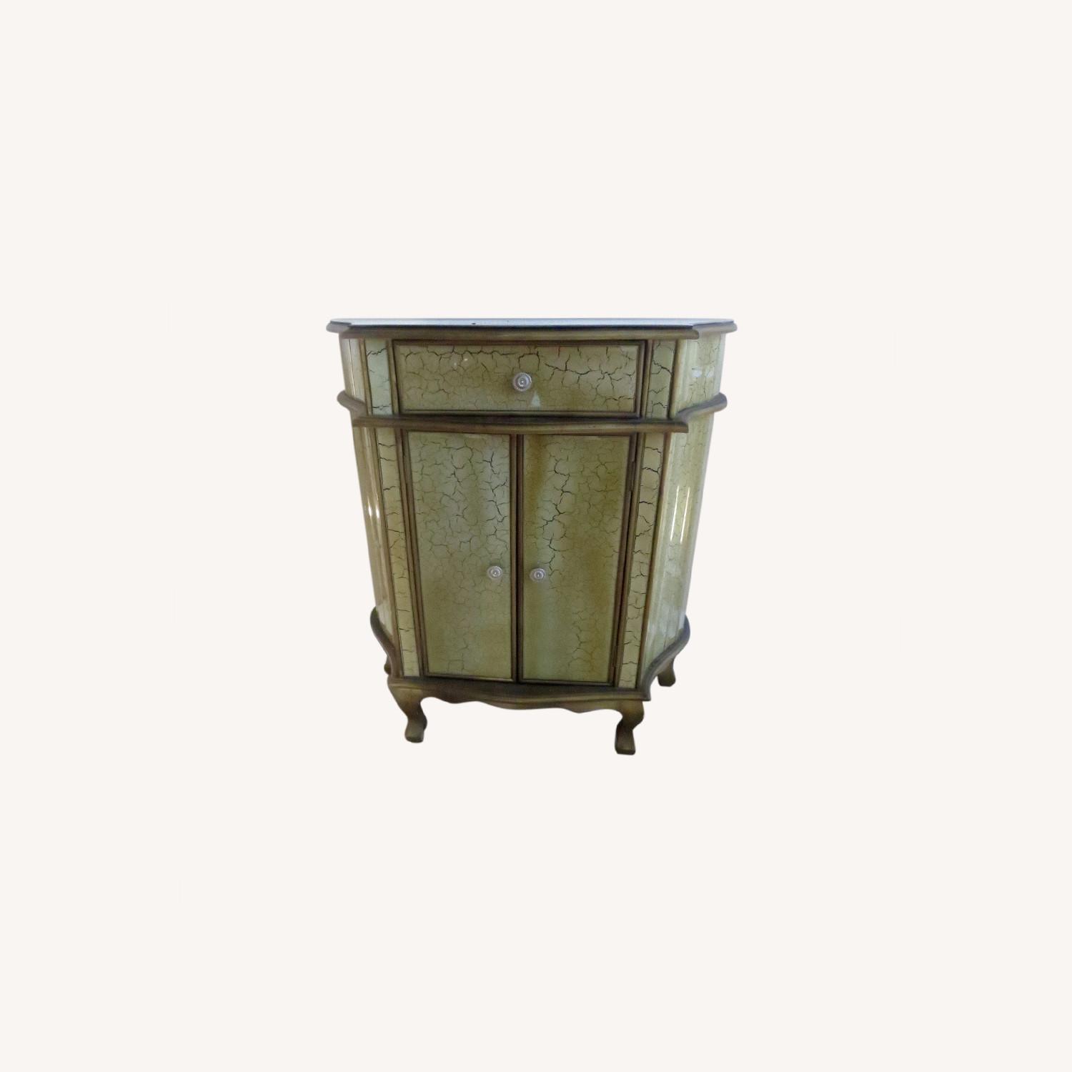 Seller's Notes:This is a 2 Door 1 Draw Storage Chest. Art Deco Style High gloss mirror finish. Color is Gold with black veining. Near mint. Some slight scuffs on the legs.