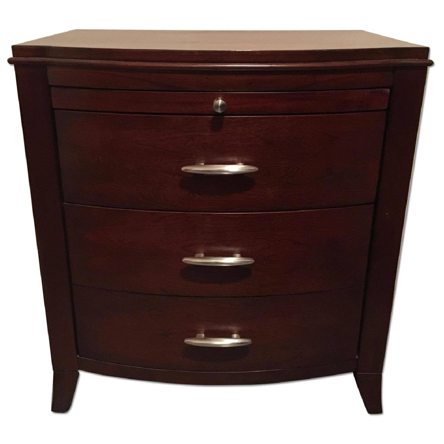Seller's Notes:This nightstand table is practically new. We've had it for a few years and it's a great table. Good amount of surface space on top, a pull out tray, and two drawers. The bottom drawer is nice and deep. The color is a dark red/brown and fits in a contemporary or traditional bedroom. We're selling it because we're moving and can not use it in our new space.