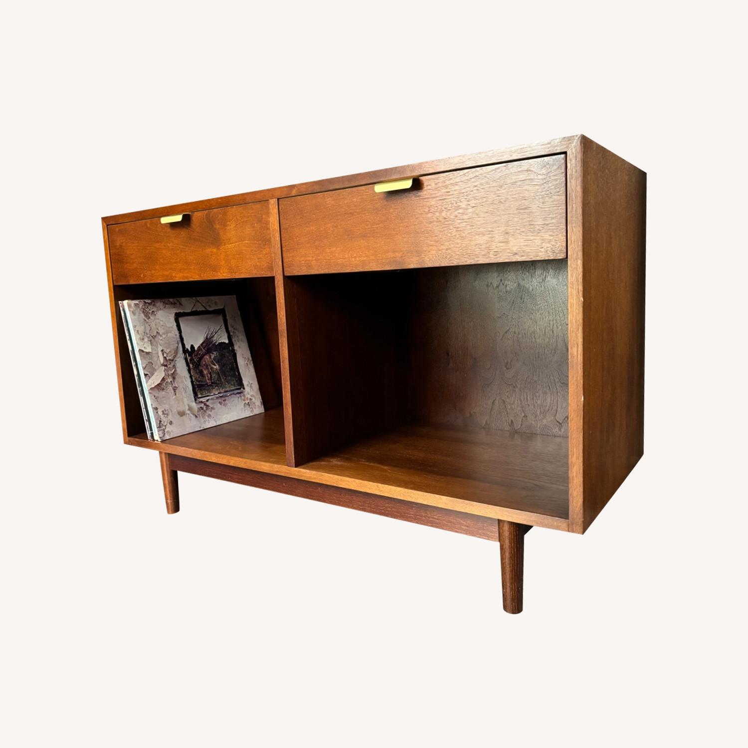 Seller's Notes:This 1 x 2 Drawer record storage cabinet is designed for those looking to store their LPs, with accessory drawers and room on top for a turntable and amplifier. This cabinet features a solid Maple in a dark walnut color dovetailed drawer box with soft-close drawer slides and Brass Pulls.