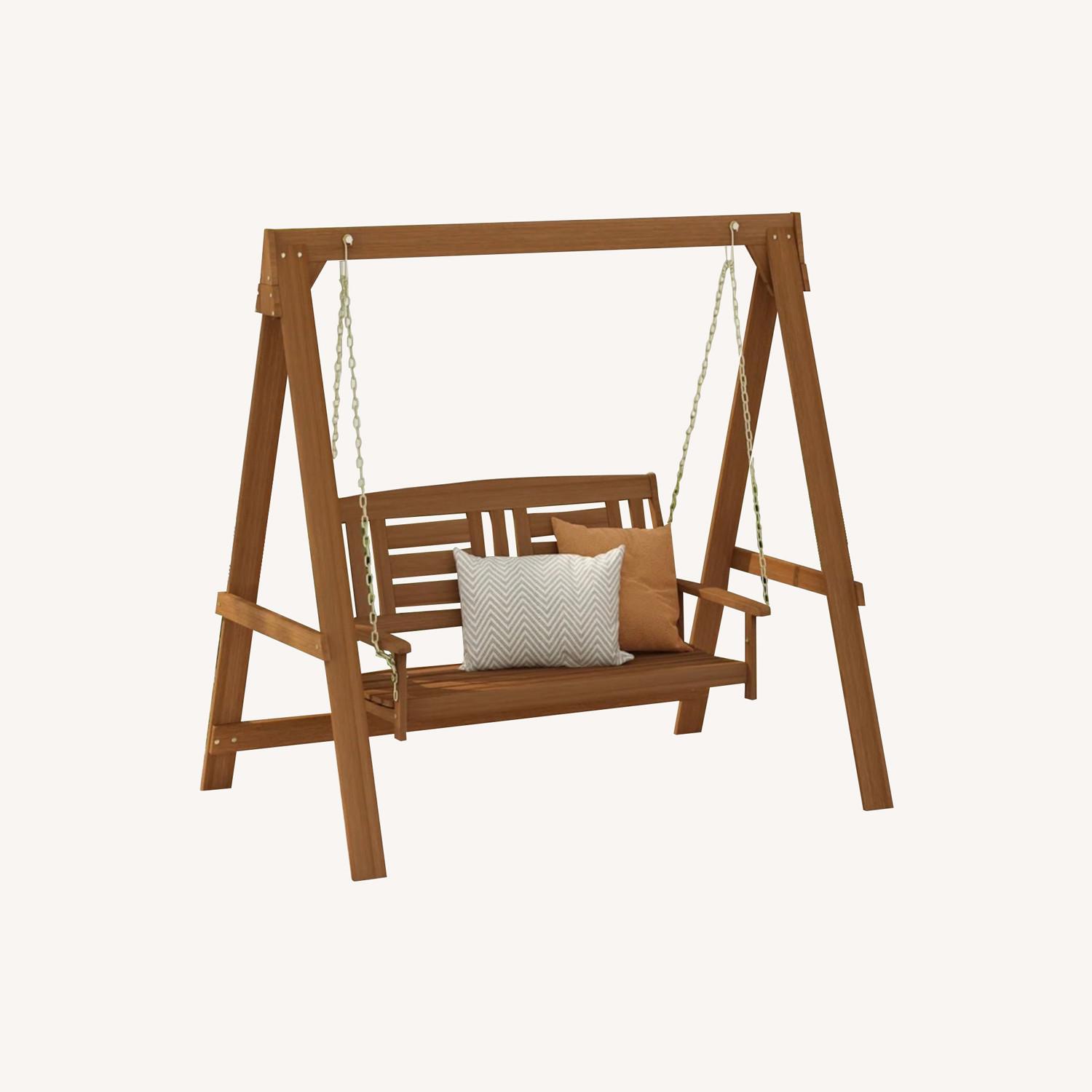 Seller's Notes:Brought this beautiful swing for my mom. The only issue was that the color didnt match with her porch. It is a brand NEW SWING. We sat on it once and took it apart. Seating Capacity: 2 Outer Frame Material: Solid Wood Frame Included: Yes. Cushions Included: No. Chain Included: Yes. Weight Capacity: 350 lb. Canopy Included: Natural Wood Grain Color Variation (No item has the same grain color, finish, or wood knots due to natural factors.) Sit back and soak up some sun beside a buddy with this porch swing. Crafted with a solid wood frame, this piece features a clean-lined swing supported by rust-resistant, galvanized steel chains that support up to 440 lbs. A natural finish gives this design a warm and approachable look, while slatted deta