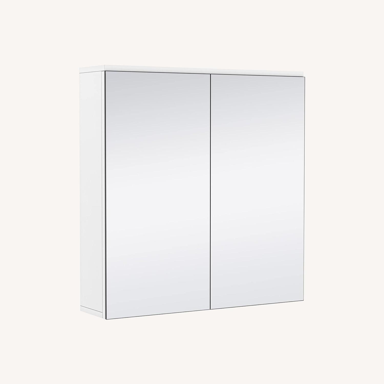 Seller's Notes:2-Tier Wall-Mounted Storage Cabinet with 2 Mirror Doors and Adjustable Shelf.