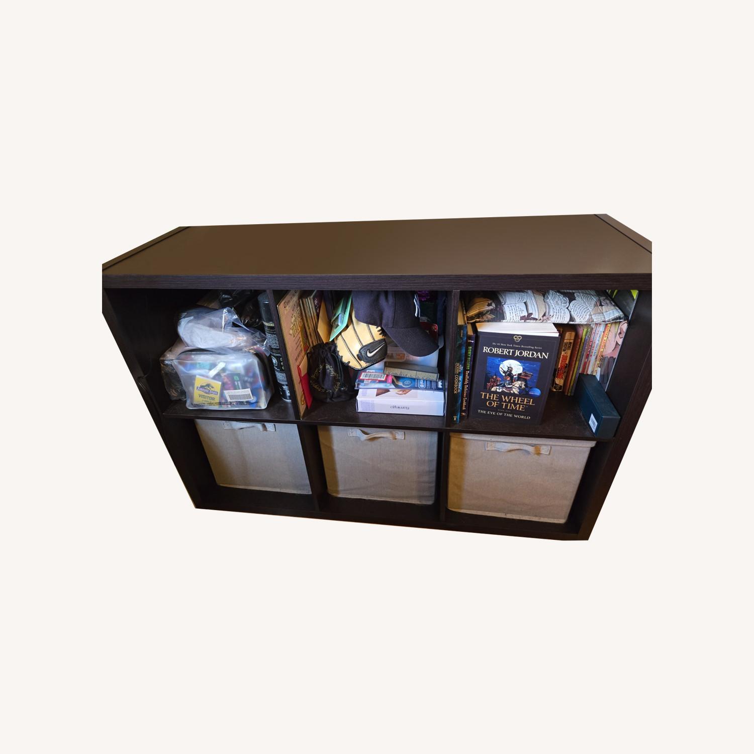 Seller's Notes:2x3 cube organizer. As you can see it fits a lot. Can throw in the 3 fabric boxes in bottom 3 cubbies for free. Blemish is only in 1 of the cubbies, all other cubbies are mark free. Dimensions listed below. Overall height: 30 inches Overall length: 44 inches Overall width: 15 inches Cube internal dimensions: 14x14x14 inches