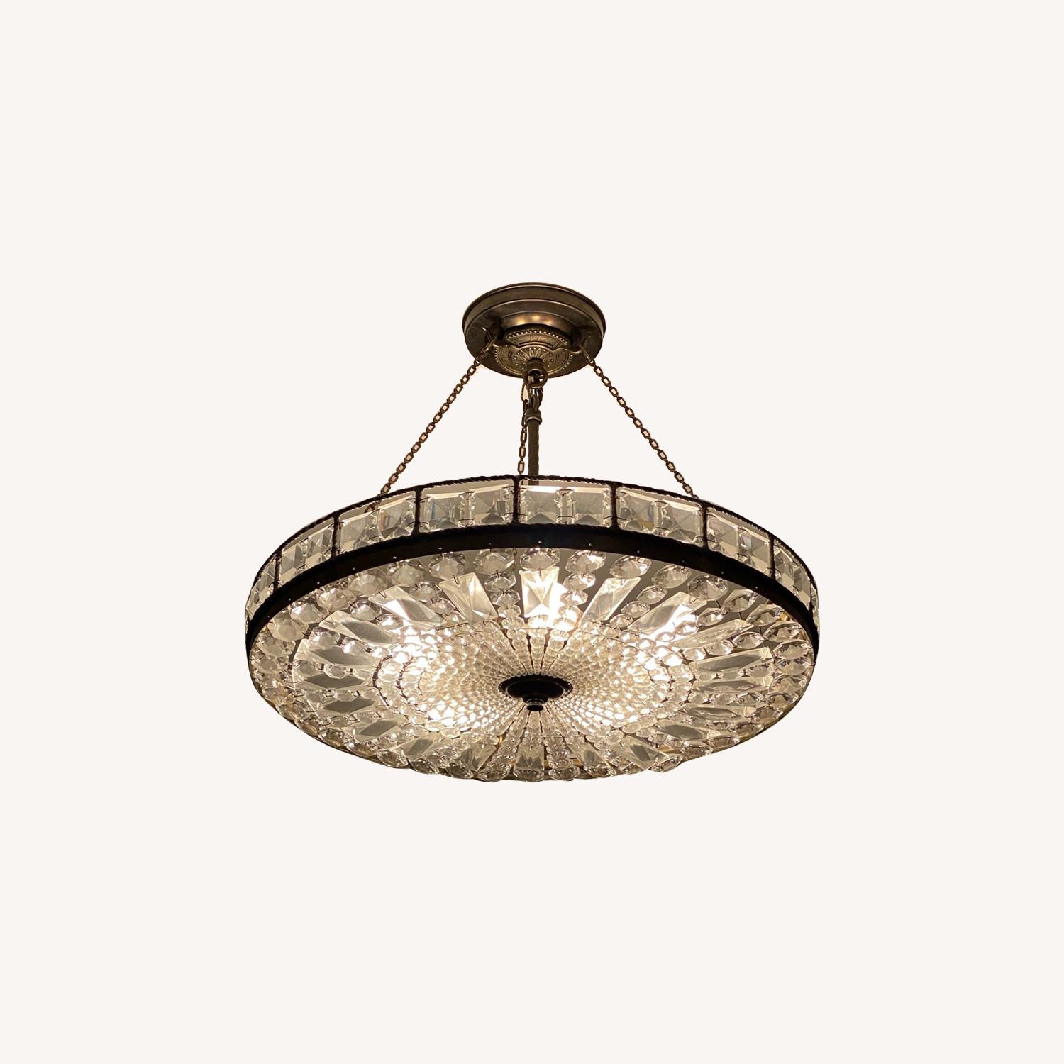 Seller's Notes:Three custom made semi flush mount crystal pendant light fixtures, with square crystal ring design. Cage from roped brass design.