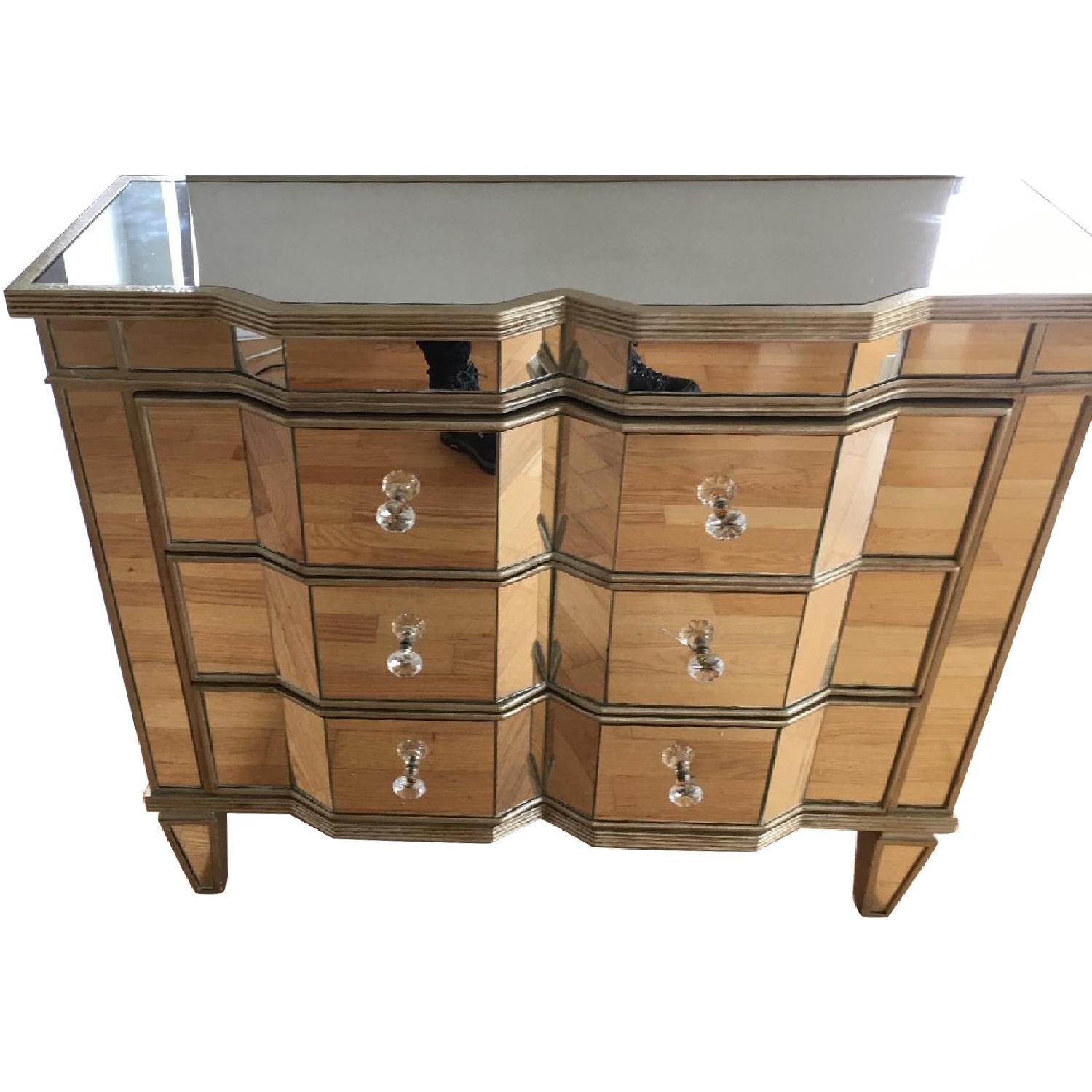 Seller's Notes:Beautiful Mirrored Dresser. Perfect for the foyer as well. 3 Drawers. 1 minor crack near the second drawer right knob, but not too big. About 2-3 inches only.