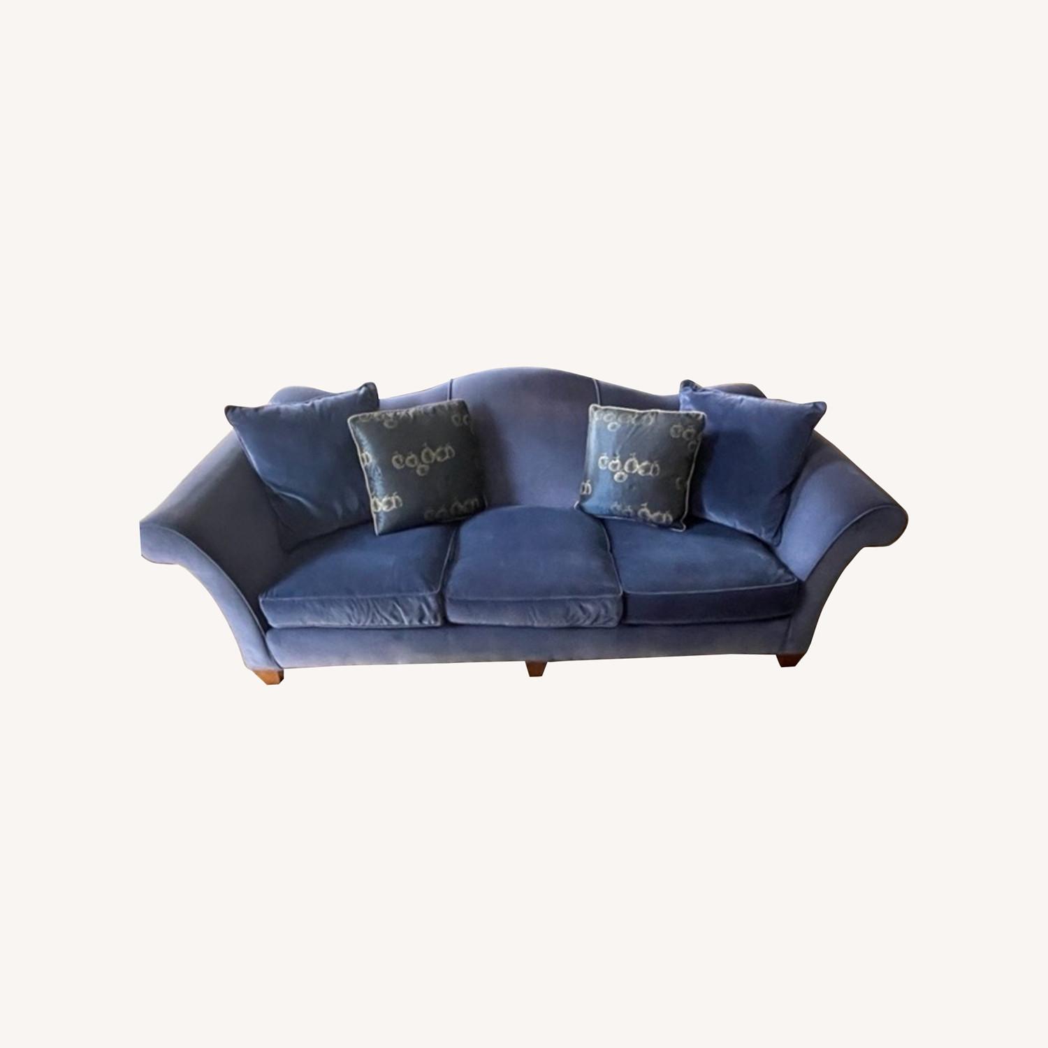 Seller's Notes:Beautiful sofa, rich velvet/velour deep blue material, great condition, slight fading in color but consistent across the entire piece - no stand out patches. No tears, scratches, stains - great condition, no pets on it, ever! 3+ people can sit comfortably. Great piece - we’re just replacing it.
