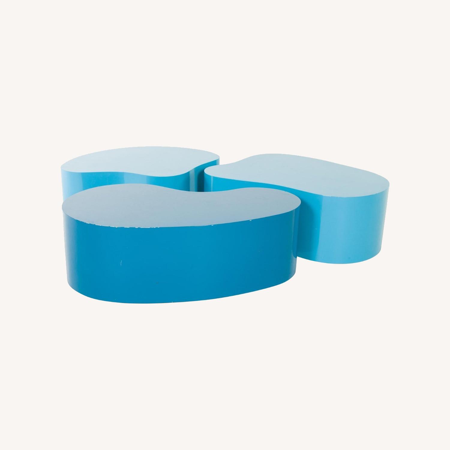 Seller's Notes:3-piece aqua and cerulean lacquered wood coffee table set with amoebic-form design.