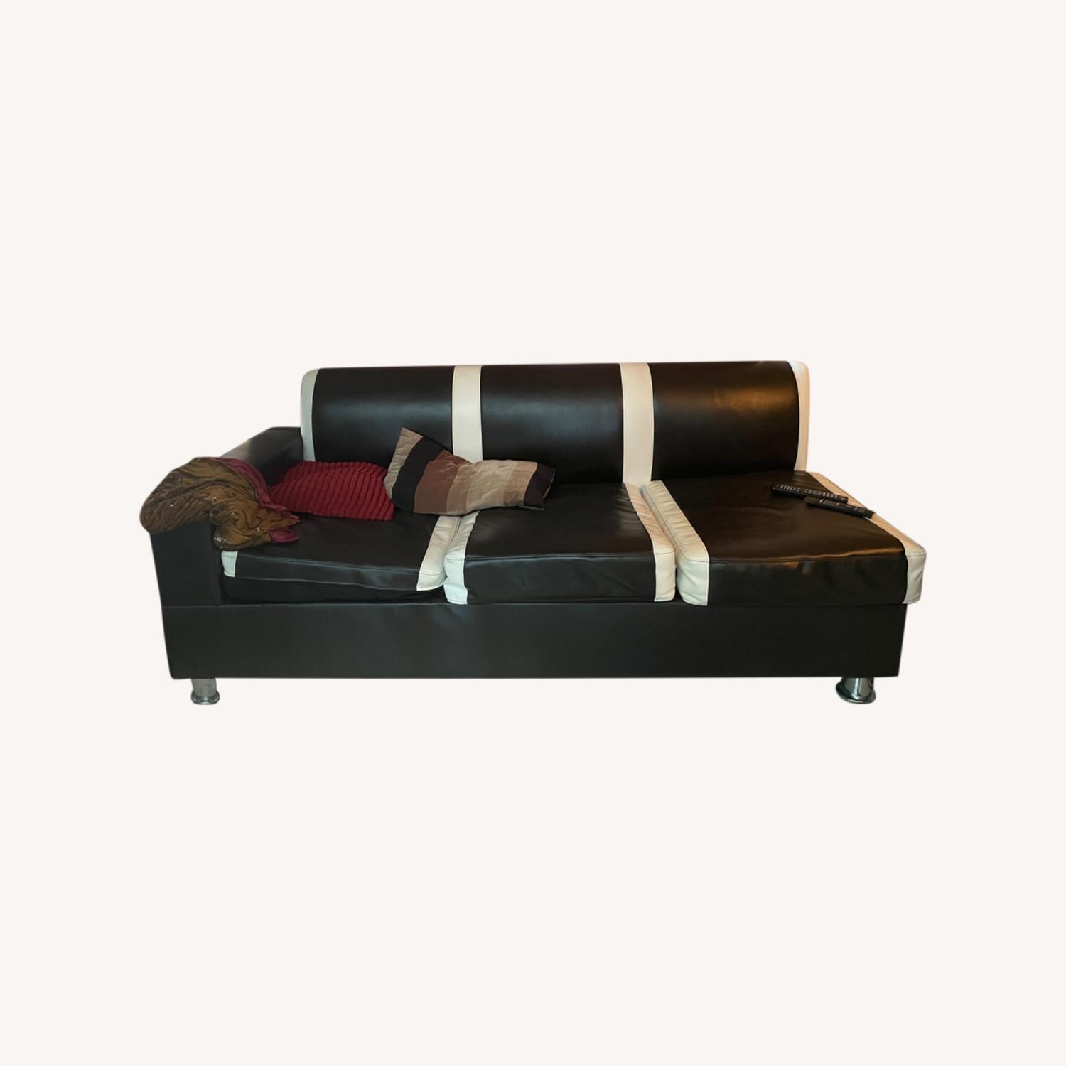 Seller's Notes:3 piece faux leather sofa set/ sectional Approximate measurements included in photos Dark brown and white Ottoman piece includes storage space, small blemish on corner of ottoman (pictured) Free chocolate brown end table piece included (pictured) Willing to sell as separate pieces. Accepting offers for different pricing Available for pickup immediately