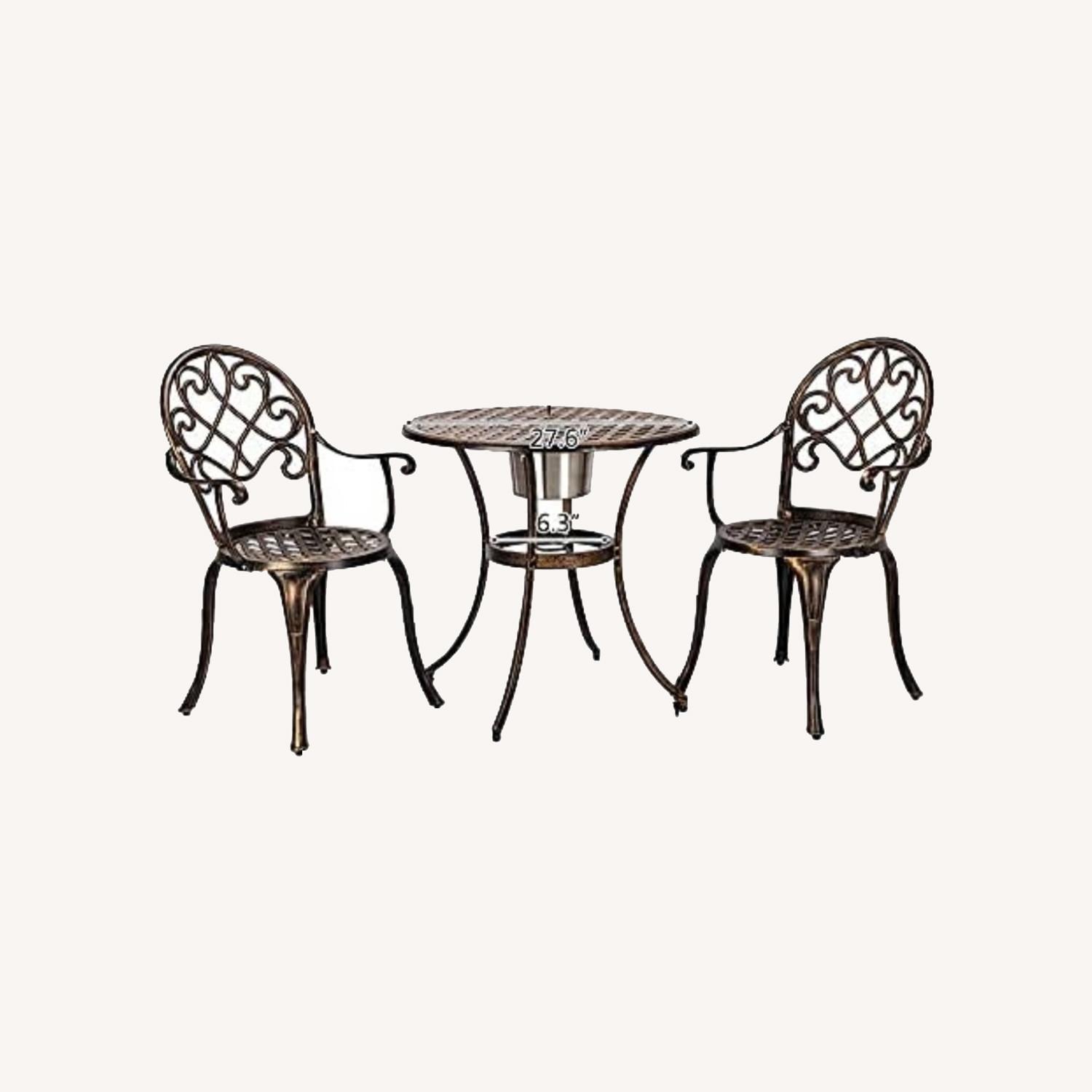 Seller's Notes:I bought this Bistro set about a year ago. It was only lightly used a few times. It has been in my backyard under my awning for about a year. The whole set is in good condition. There is a built-in ice bucket with a cover at the center of the table. Idea for patios, decks, and garden areas!