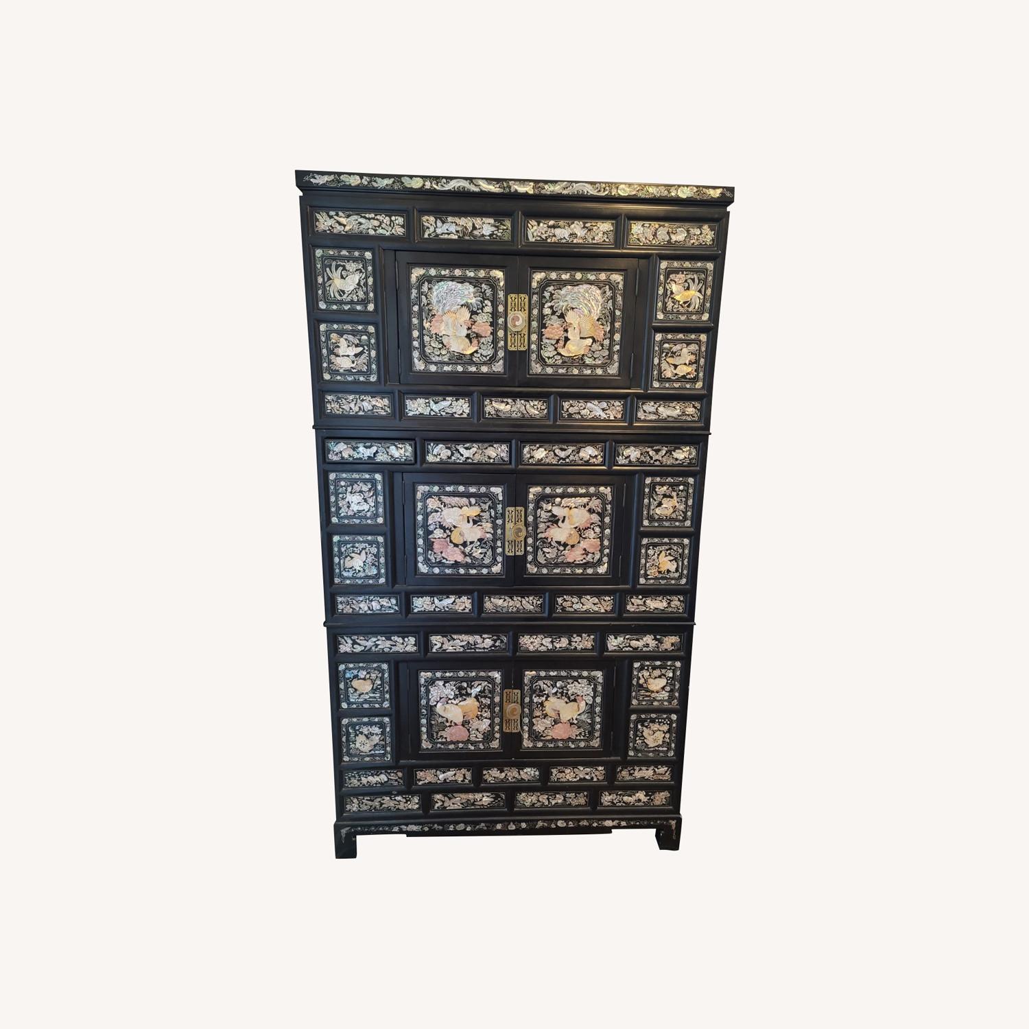 Seller's Notes:This 3 tiered chest can come apart into 3 separate chests stacked on top of each other. It forms one large armoire. The entire piece is painted in black shiny lacquer & faces of each chest is inlayed with mother of pearl detail designs of flowers, birds, various animals. Each chest has doors that open towards you with sliding doors within (note: each chest door's hander piece needs repair or replace for new knobs).