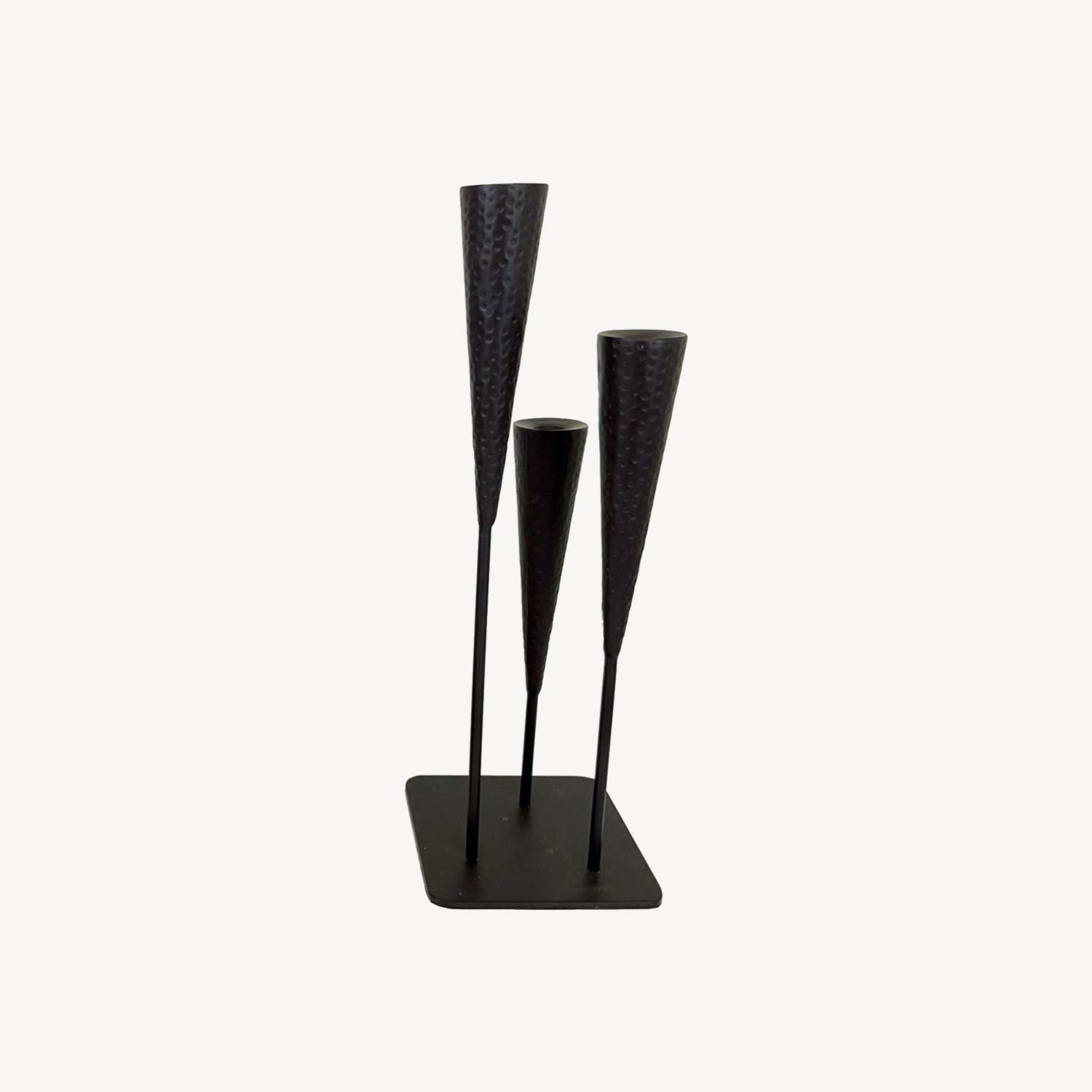 Seller's Notes:WROUGHT IRON CANDLE HOLDERS Great condition Felt bottom SIZE: Prongs: 18"×14.5"×12" Base" 6"x6" TRIPLE PRONG PRIMITIVE HEAVY BLACK METAL, NICE HOME DECOR 50% delivery costs are covered.