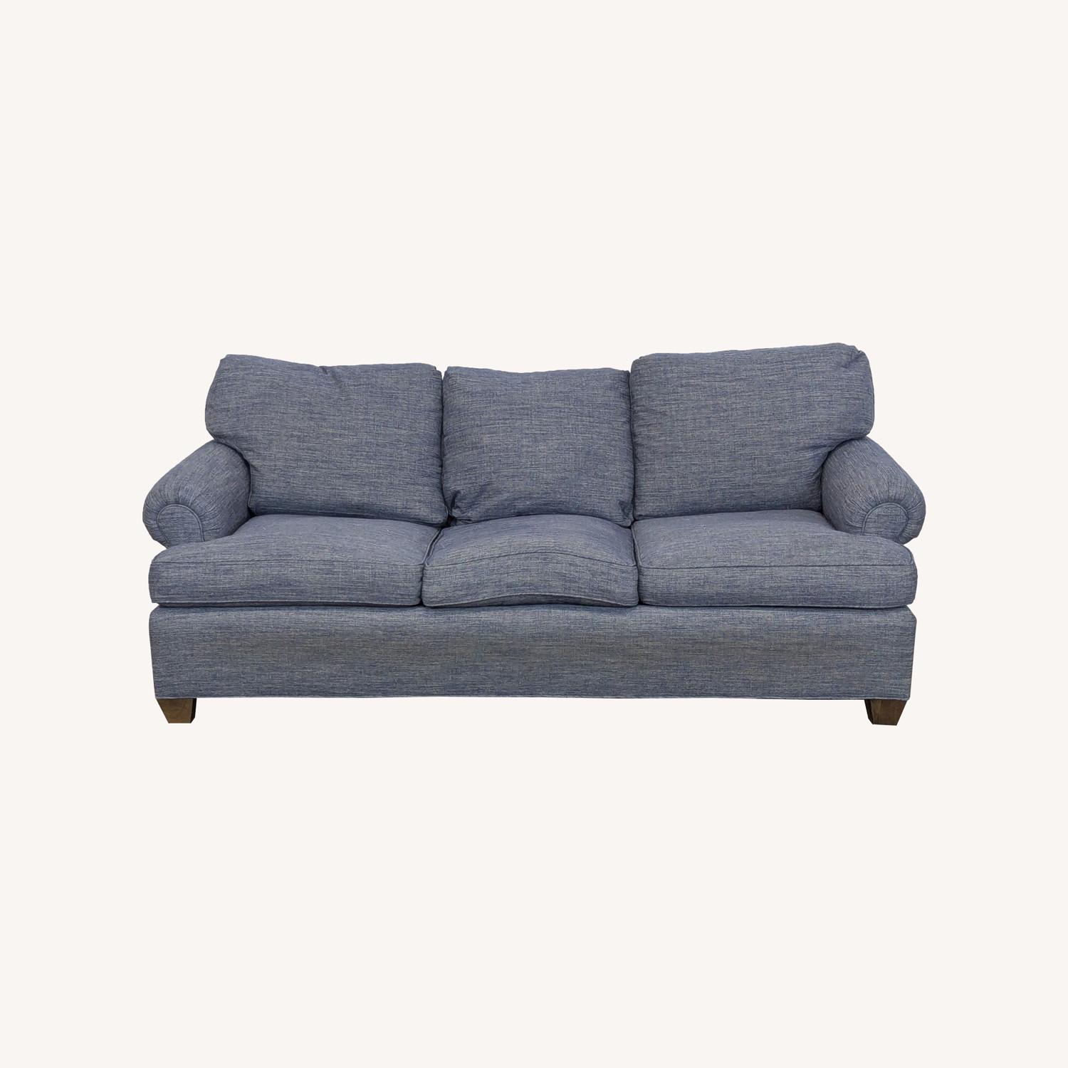 Seller's Notes:Features Heathered Blue upholstery with welted trim, rolled arms and wood legs.