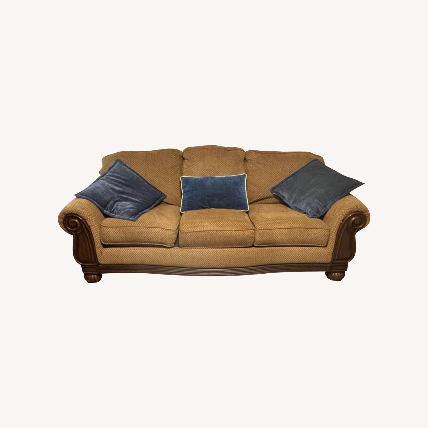 Seller's Notes: Brown sofa/couch. Length: 7ft 6in. Width: 3ft 2.5in. Height: 3ft. Cushion size: 24in by 22in by 5.5in