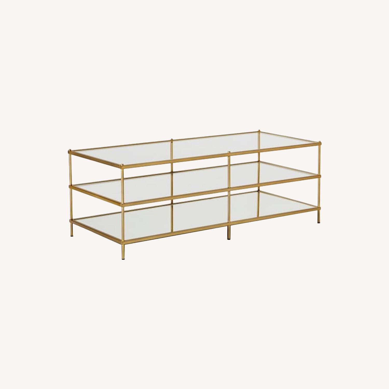 Seller's Notes:3 tier glass shelf gold coffee table. Great condition!