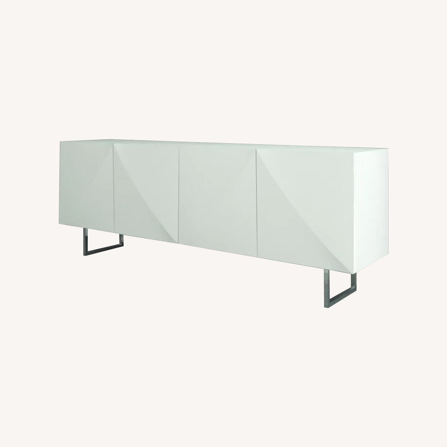 Seller's Notes:This elegant TV Stand for TVs up to 88" with sculpted doors. Adjustable Doors with holes to run wire through for a cable box.