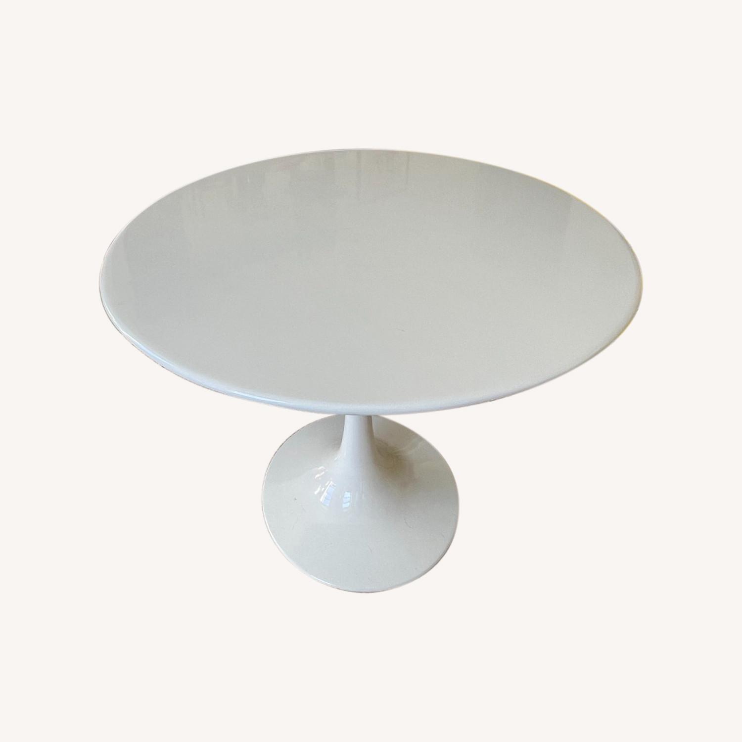 Seller's Notes:Purchased in 2021 for a compact dining space, but replacing with a larger table in a new apartment. This Saarinen-style tulip table has been gently treated, and is perfect for apartment living! Its fiberglass top has some very fine scratches that are only visible from certain angles. Tabletop has a UV-resistant top coat and chip and scratch-free coating. The table is extremely sturdy and balanced. 36" diameter round top seats 4 comfortably.