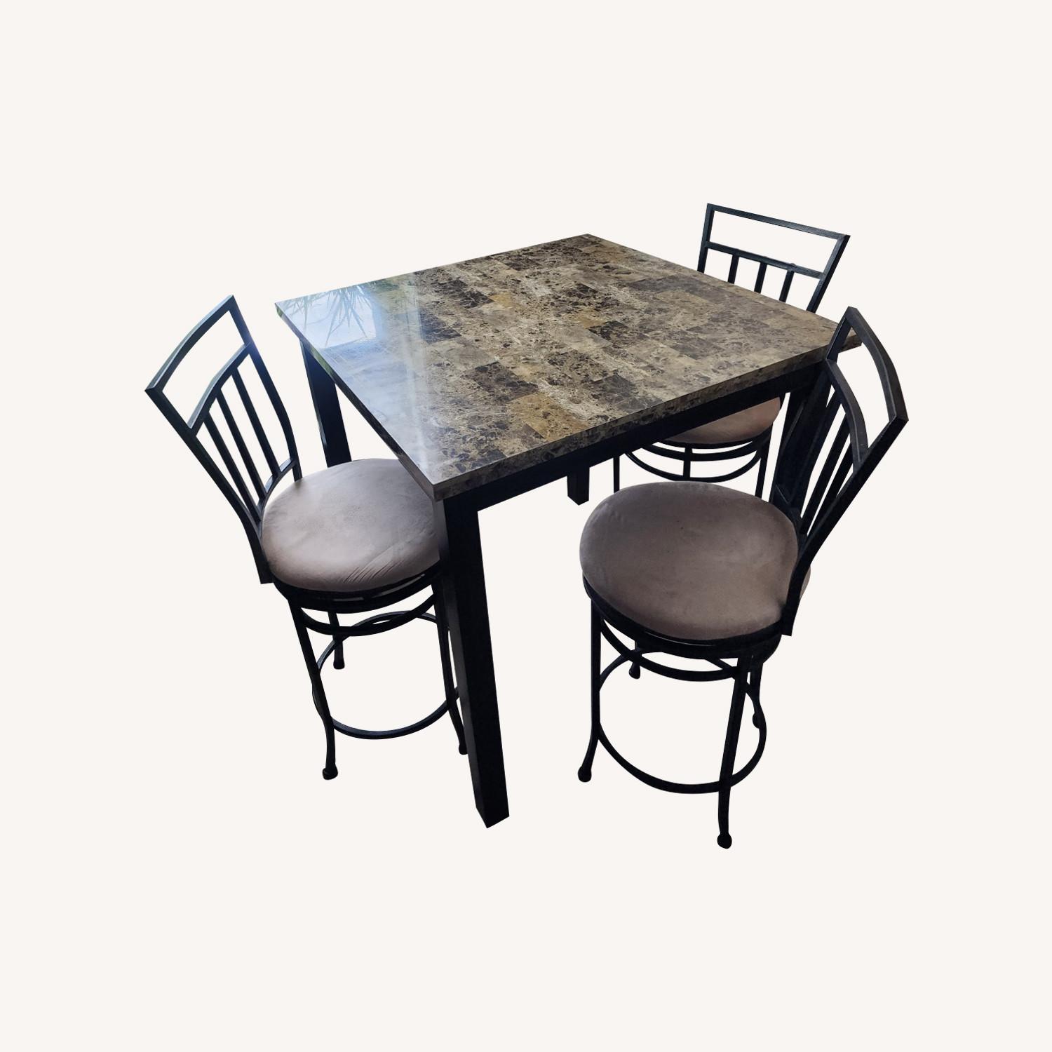 Seller's Notes:Gently used apartment or kitchen sized dining set with swivel chairs. Green marble laminate surface. Minor blemishes from use in 2 different apartments. One of the chairs doesn't swivel well, but could probably be fixed up with some spray lubricant.