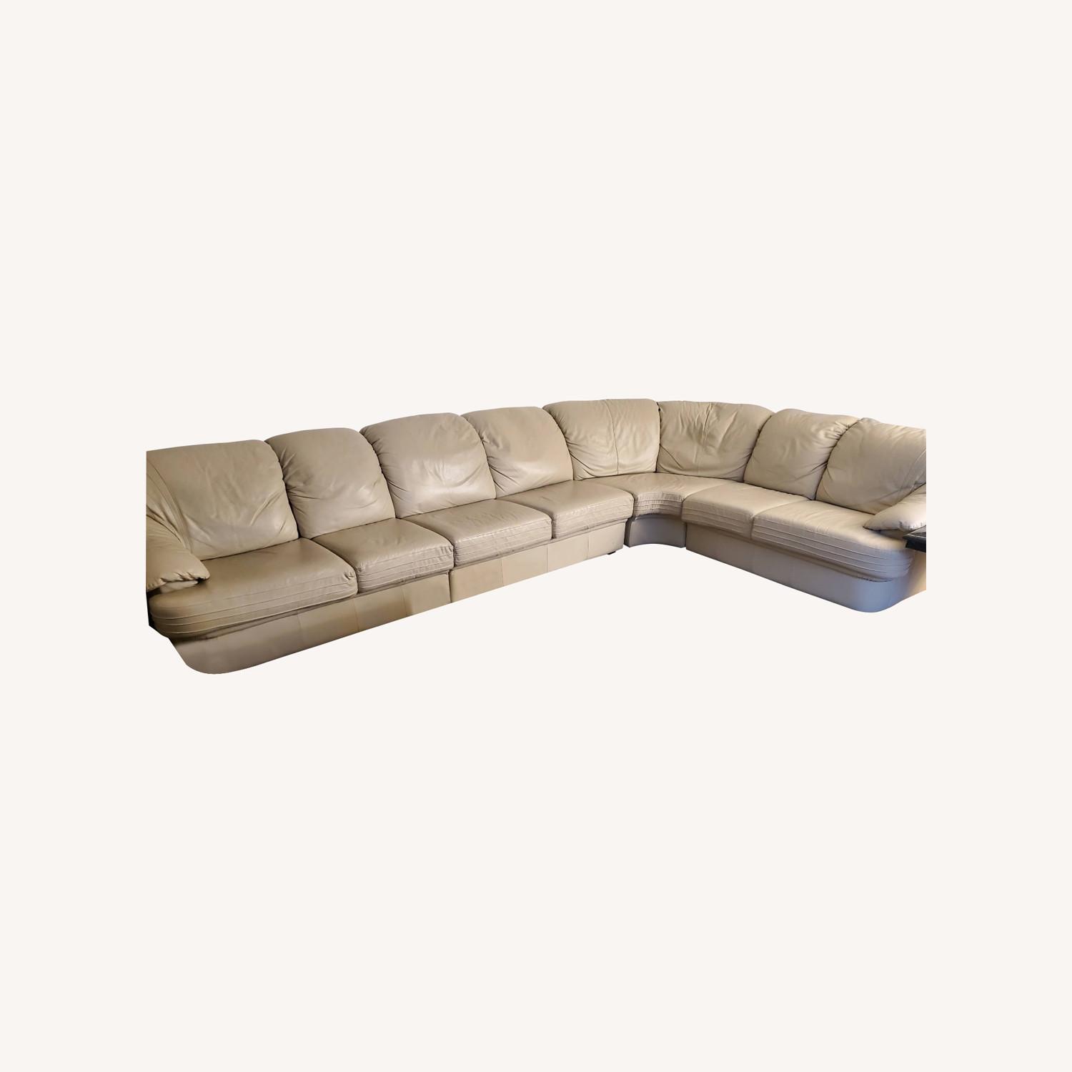 Seller's Notes:Stunning 4-piece sectional leather sofa provides ample seating for 6-8 people. Expansive leather sofa is the perfect balance of structure and comfort with pillow-like armrests and back and cushions that are comfortable as well as supportive. Soft, luxurious yet firm leather in a stone colorway and style that complements any decor from modern to transitional. Attention to fine details like seaming along the armrests and cushions (pictured) elevate the design. In excellent, like new condition. Both material and construction will last a lifetime beautifully but we are downsizing and unfortunately have to let it go. Beautiful granite coffee table (SOLD,) 2 side tables, and console table (SOLD) also currently available through my other active listings.