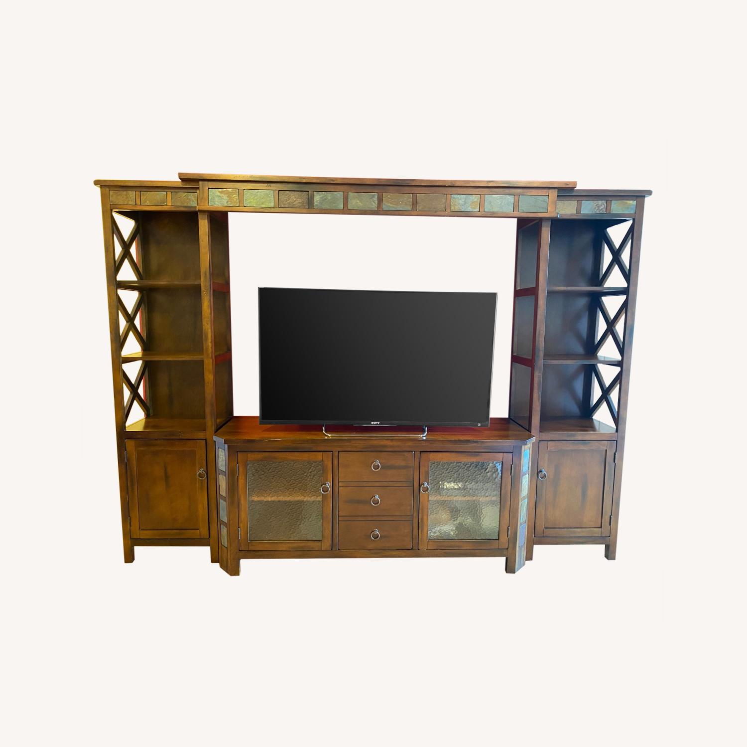 Seller's Notes:This beautiful 4-piece wall unit includes 5 cabinets for storage and 6 shelves that can be used for décor. Attractive stonework trimming at the top. In great condition except for one cabinet handle that is loose. (Television and decorative pieces not included).
