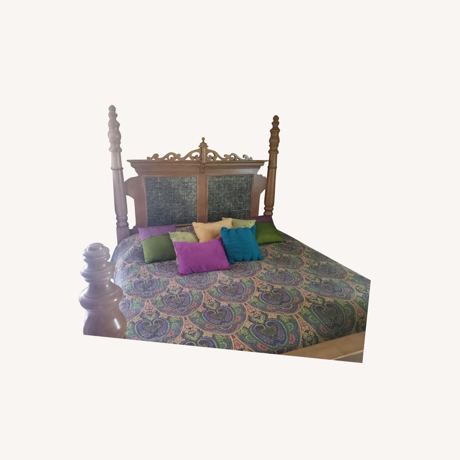 Seller's Notes:This is a unique king bed frame that you won't find in any store. This thick wood frame has chunky posts and scrolled wood detailing at the head and foot. The headboard has a large handcrafted punched tin panel. The side rails are also wood and the support rails are also included. This has been disassembled if you choose to pick it up yourself. The foot posts are shorter than the head posts, at 57" tall . (head posts are 81" tall). This is in perfect condition....used in a guest room. You can also use 2 twin sets instead of a king set. GREAT BARGAIN !~!~