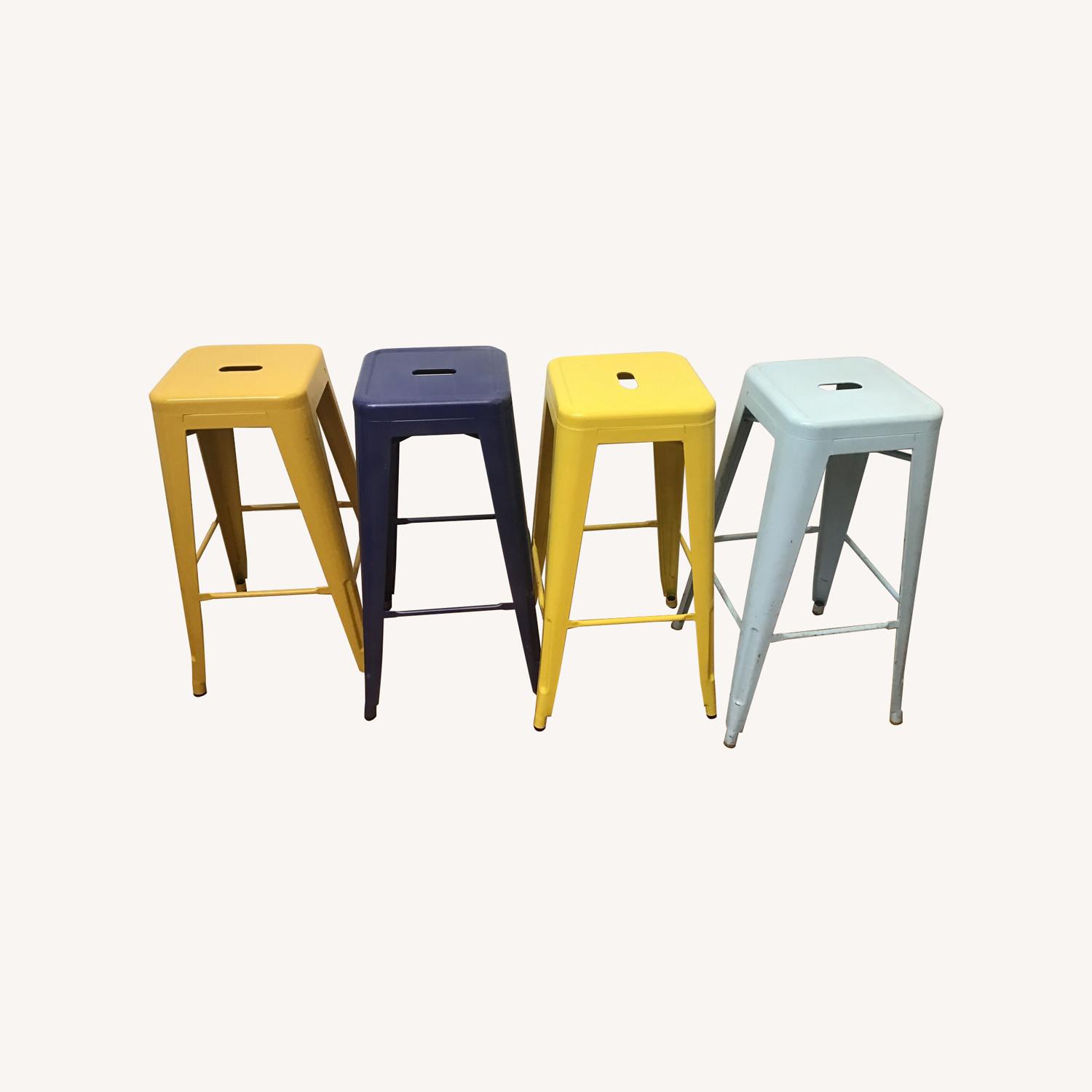 Seller's Notes:These 4 tolix stools are sturdy, stackable and cute. The two yellow stools are in excellent condition. The dark blue stool has minor scratches throughout. The light blue stool was originally silver and has many scratches where the paint has been removed.