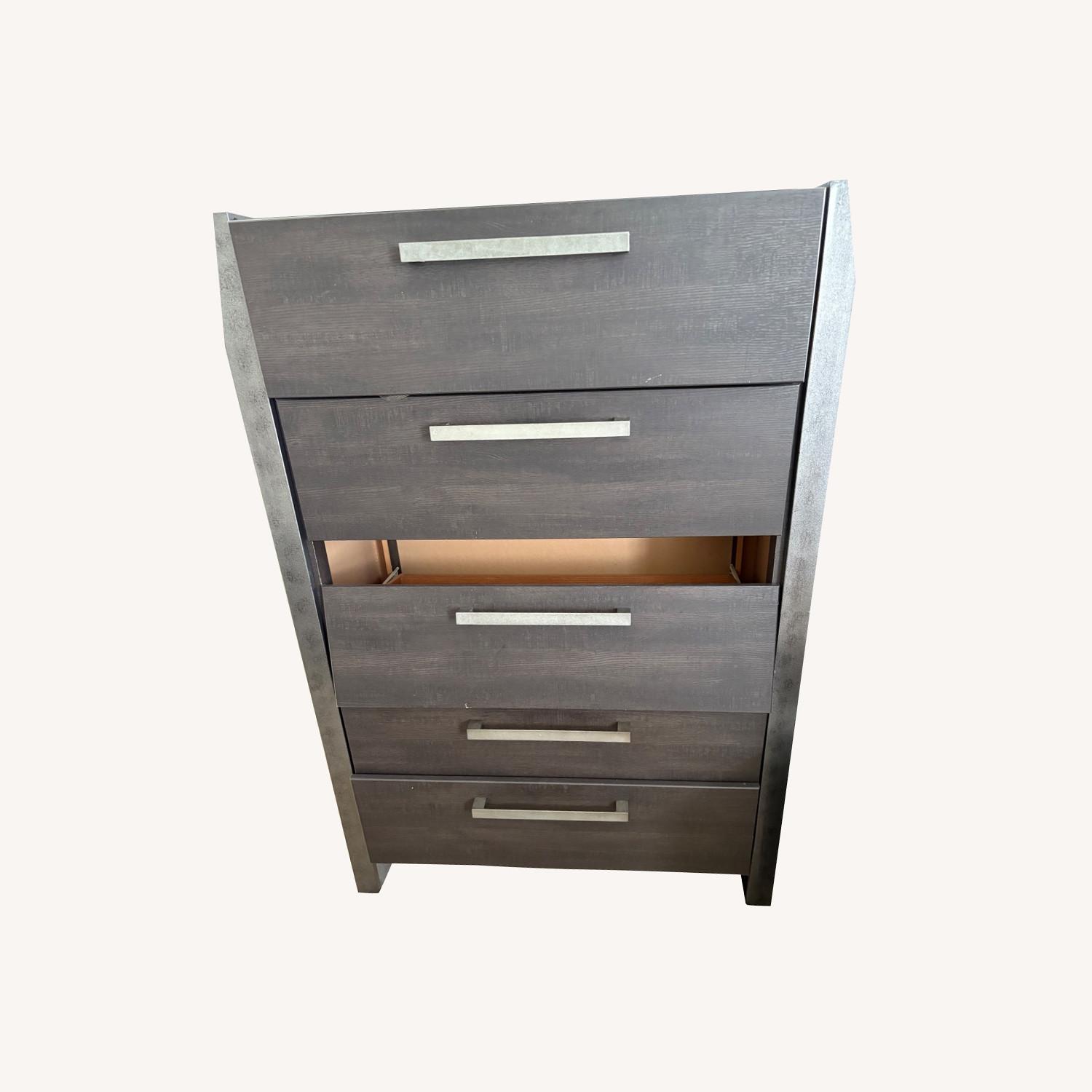 Seller's Notes:A durable and stylish storage solution, this tall dresser chest is crafted with robust pine wood and adorned with mindy veneer. It boasts five drawers, each with sleek modern chrome handles. The full extension ball-bearing glider tracks ensure smooth and effortless drawer movement, making this chest a perfect blend of functionality and contemporary design. Check out our Tal collection for more.