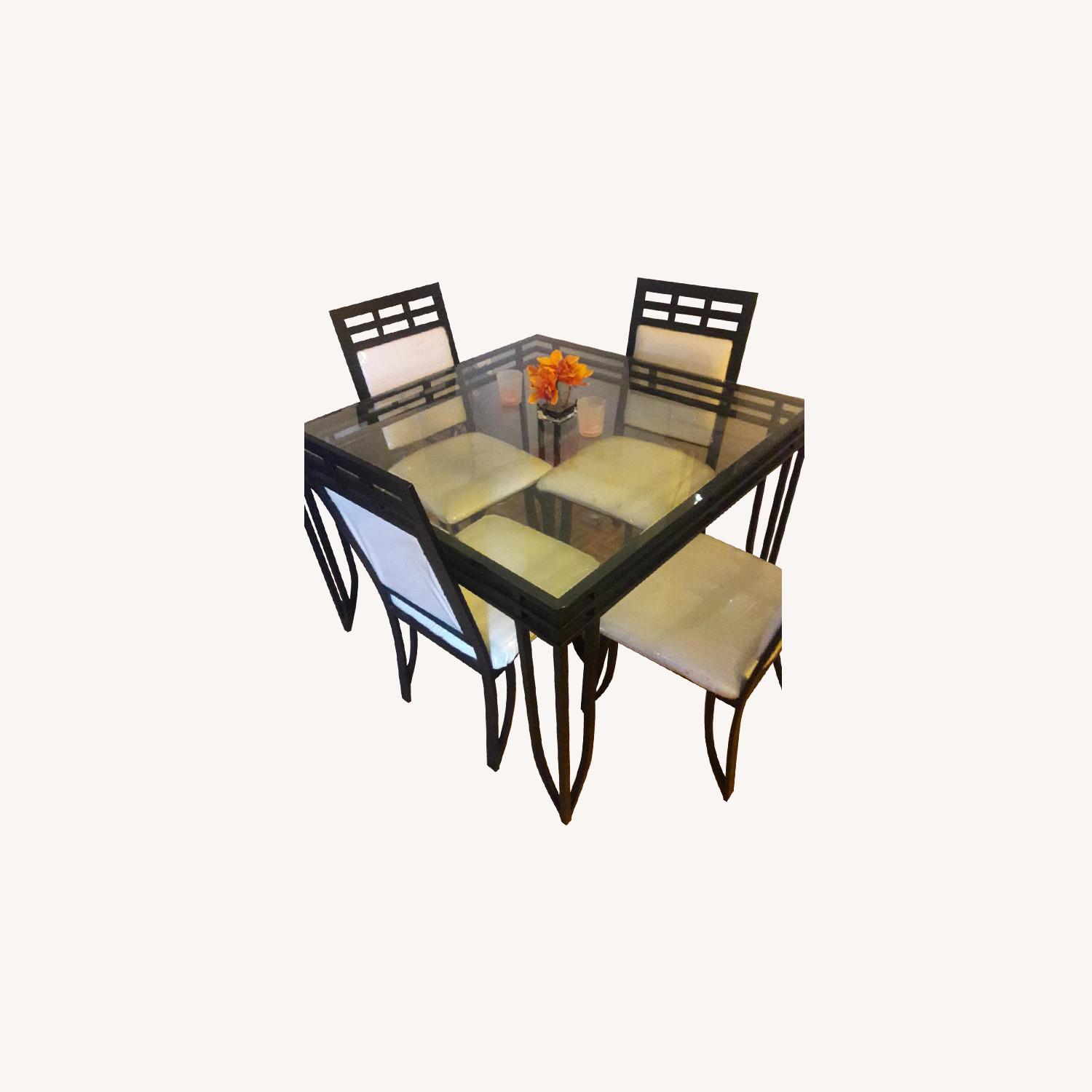 Seller's Notes:Glass table with 4 matching fabric chairs. Iron frame. Few starches on table but nothing major. Chairs has plastic on them but can be remove. 2 of the chairs has small stains but can be cleaned when plastic is removed.Plastic has few rips but has nothing to do with actually condition of chairs. Chairs is 18 inches wide and 35.5 inches in height. Table is 42 inches in width and 30 inches in height. Black frames for table. White fabric chairs with black frame.