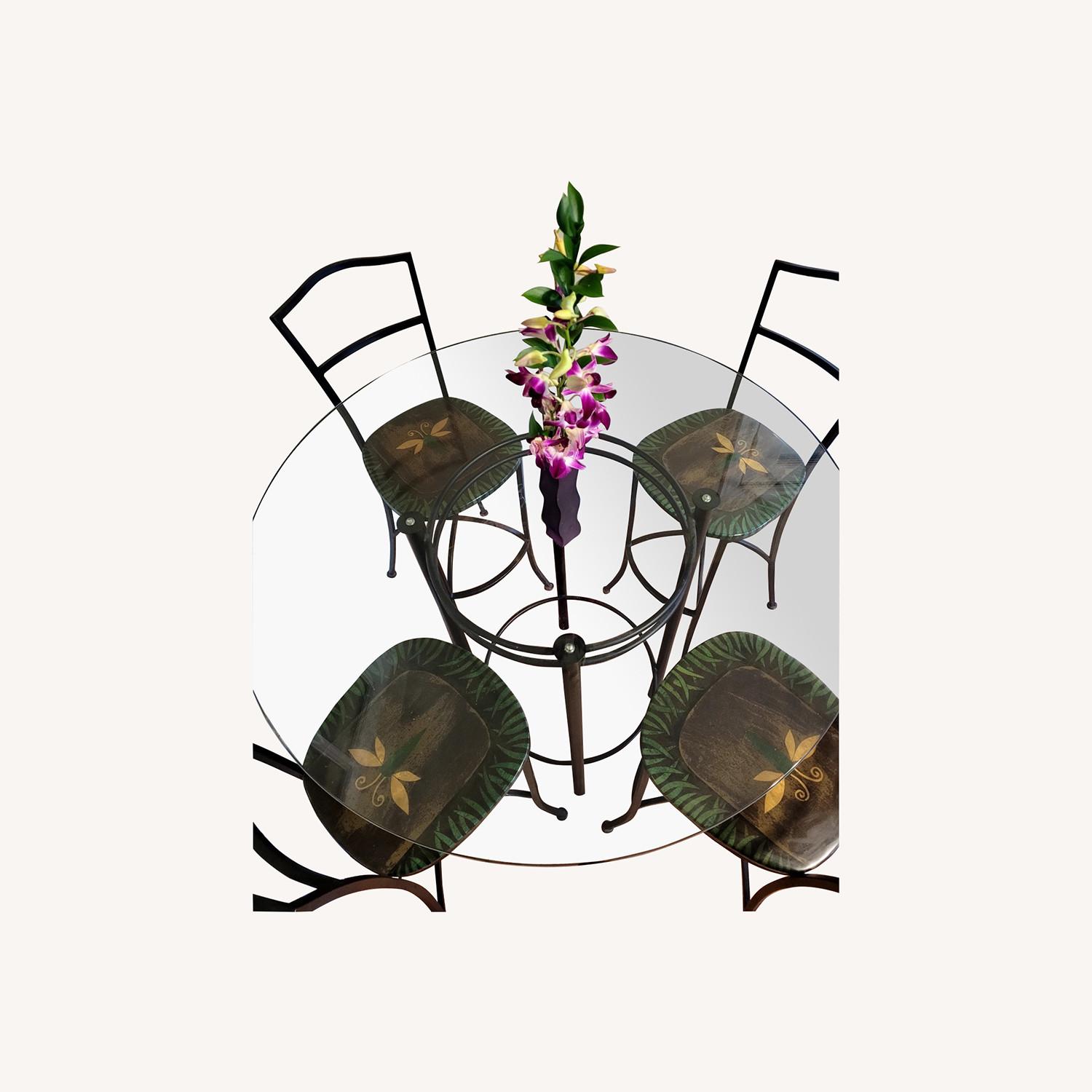 Seller's Notes:Perfect for entertaining inside and out! 6 exquisite bar seats on wrought iron. Hand painted and laminated, in perfect condition. Will not scratch. 30” high seats. Sold as a group. 42” diameter/ 42” tall glass bar table with wrought iron base. Seats 4 comfortably. 3/4” thick glass top. Excellent condition, like new. 6 Seats: $600 Bar Table: $100 Bought together $550