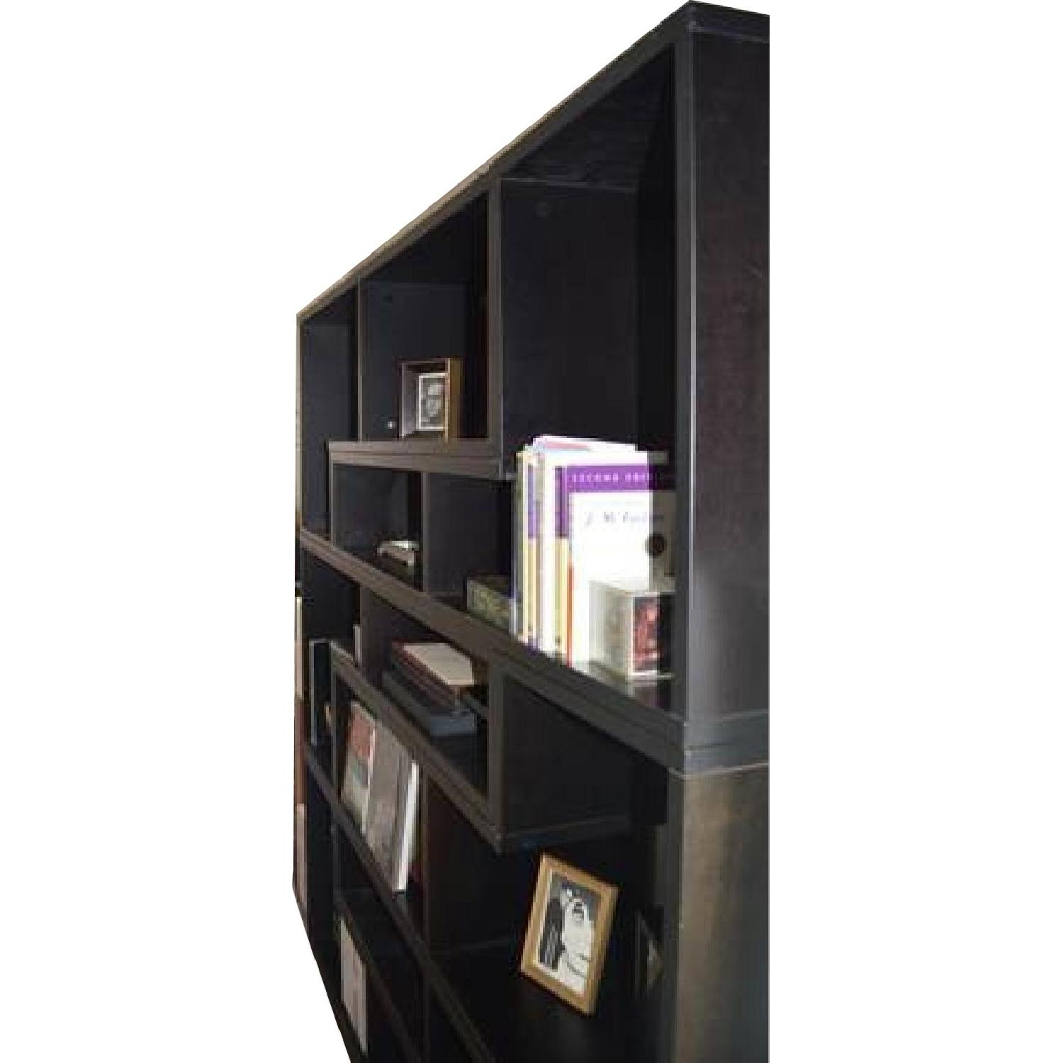 Seller's Notes:Six large black wooden L-shaped modern shelves from the now defunct Door Store (bought in 2005). Each are 18-inches deep, 26-inches high by 59-inches long