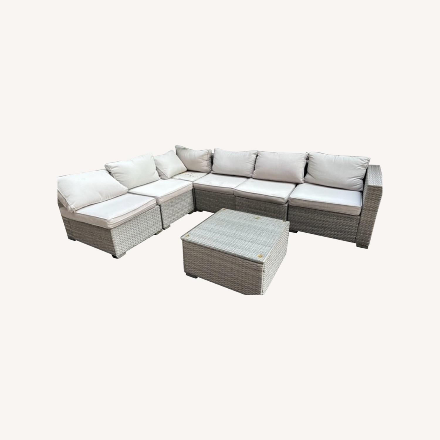 Seller's Notes:This furniture is about 2 years old and is in good condition. It includes 6 pieces for a complete outdoor seating area All-weather design for year-round use Includes: 3 arm sectional seats 2 armless sectional seats 1 coffee table with tempered glass Thick cushions for added comfort