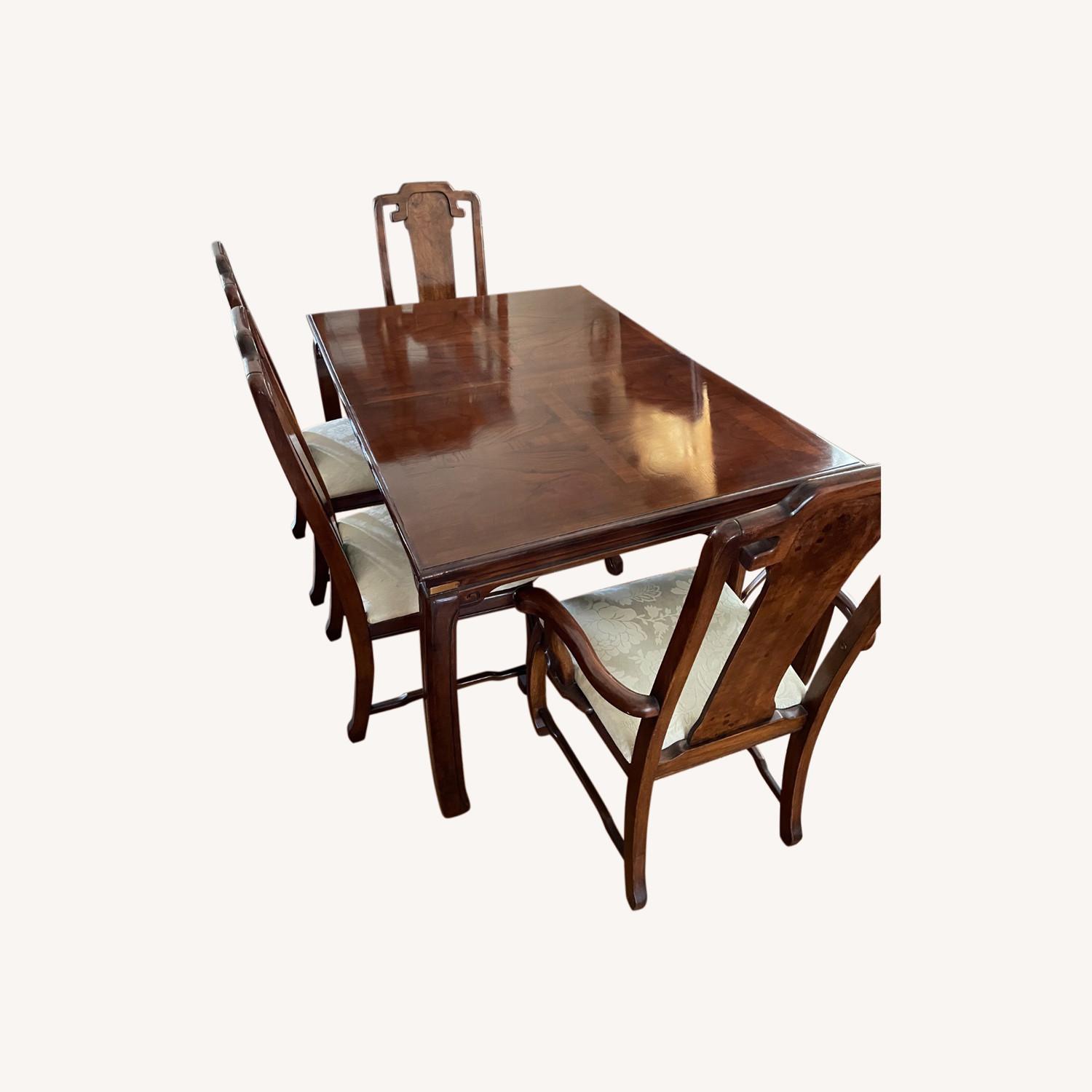 Seller's Notes:Cherry wood dining set, very well maintained. Includes extendable leaf insert to expand table to 78 inches long. Also includes custom made protector pad with extra piece to fit extended table. (Protector pad and leaf insert shown in pictures)